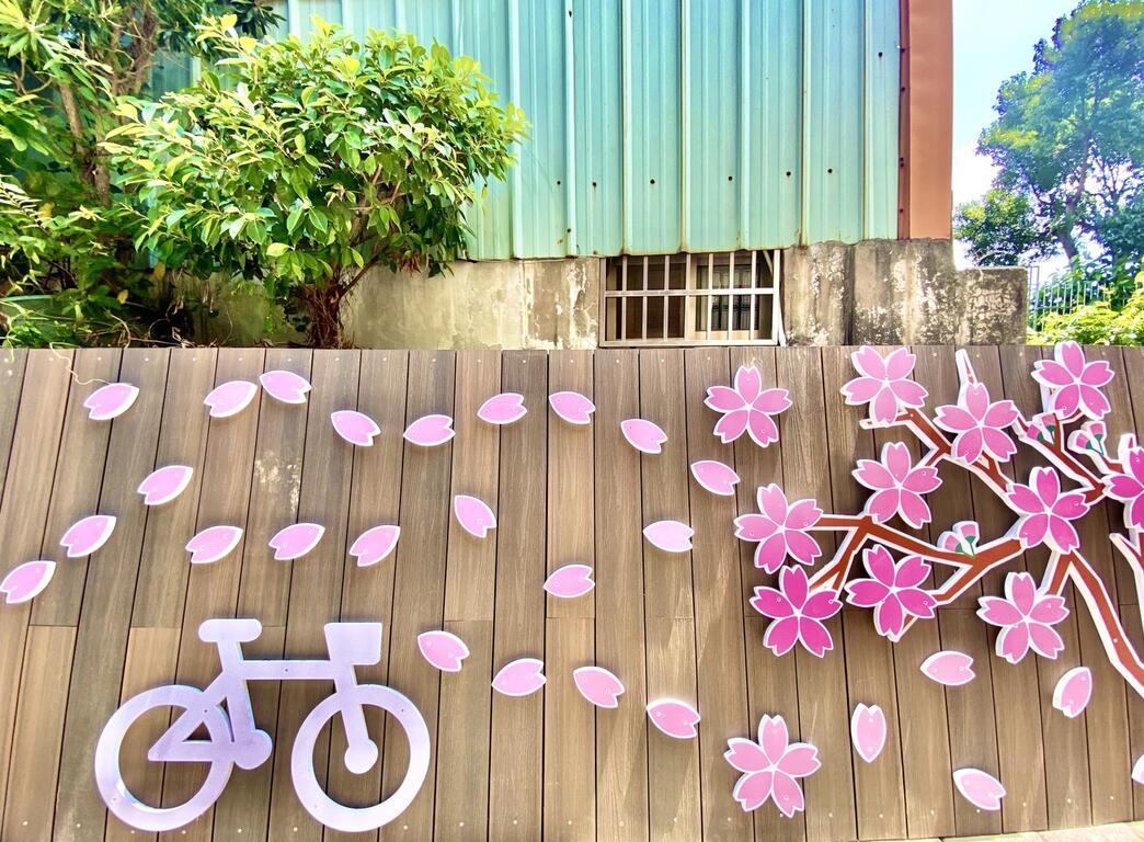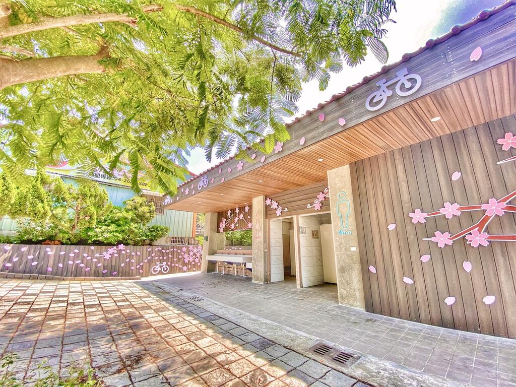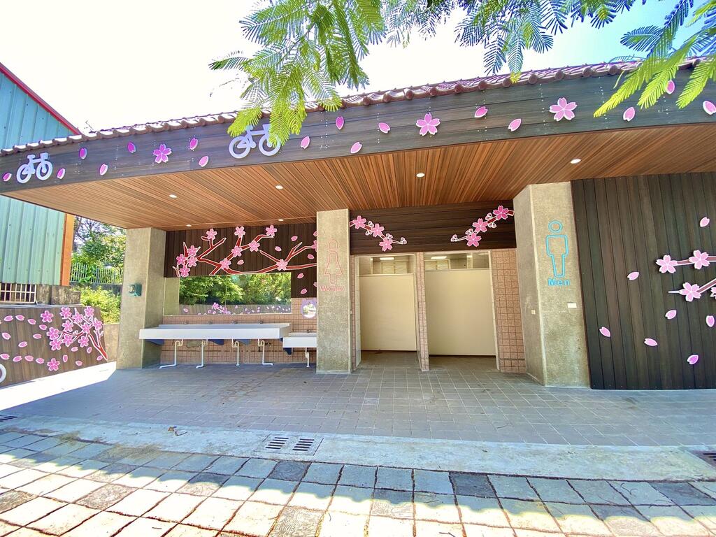 她表示,此次六角亭公廁整修,老舊設備及管線全部更新,並加強照明及通風設備,且特別增設親子廁所,部分蹲式馬桶改建為坐式馬桶,讓長者使用更加便利,外部景觀以鐵砧山櫻花美景及在地特色產業自行車為主題,並與日式木造風格相搭配,營造出異國浪漫風,還沒進公廁就被吸引。