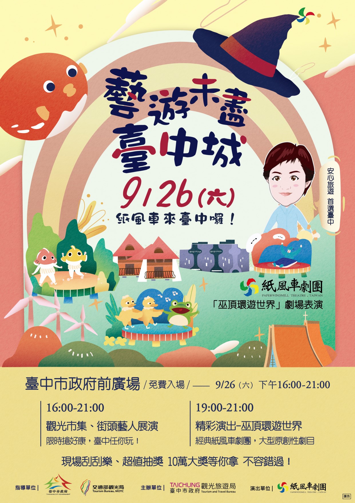 趁著國旅熱潮,為讓民眾可以深入品味台中多元文化藝術之美,市府將在9月26日於台中市政府前廣場辦理「藝遊未盡台中城」活動,邀請聞名全台的「紙風車劇團」展演,還有特色觀光市集,販售住宿優惠券、文創品、在地伴手禮等,現場更準備超過新台幣10萬元的好禮抽獎與刮刮樂活動,歡迎民眾到台中度過歡樂週末!