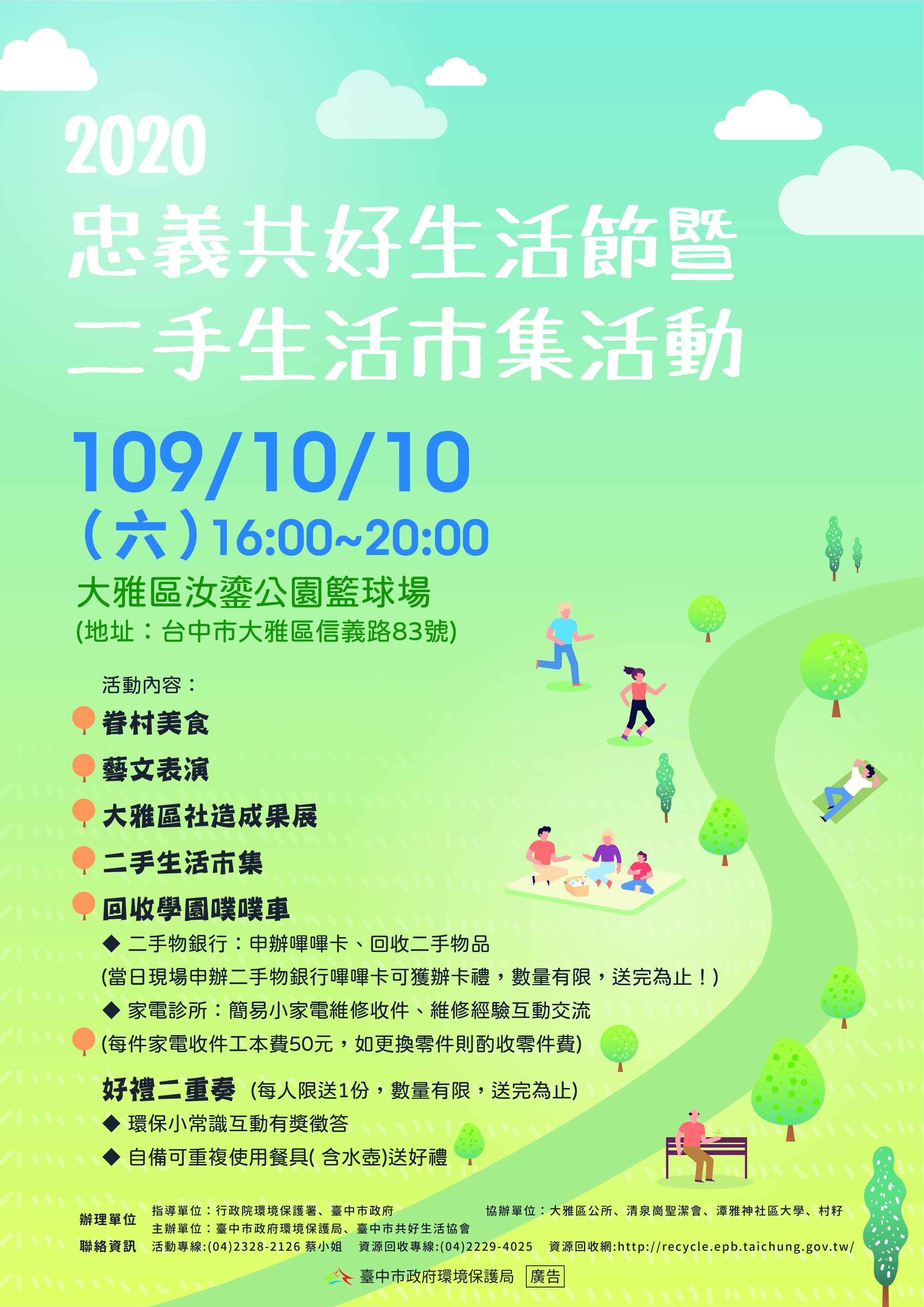快來大雅挖寶!台中市政府環保局與台中市共好生活協會合作,將於10月10日下午4時至8時,在大雅區汝鎏公園舉辦「大雅忠義共好生活節暨二手生活市集」,包含精采藝文表演、大雅區社造成果展、二手特色市集等活動,還有加碼好康(有獎徵答、自備餐具送好禮),歡迎大家相揪逗熱鬧、慶雙十做環保!