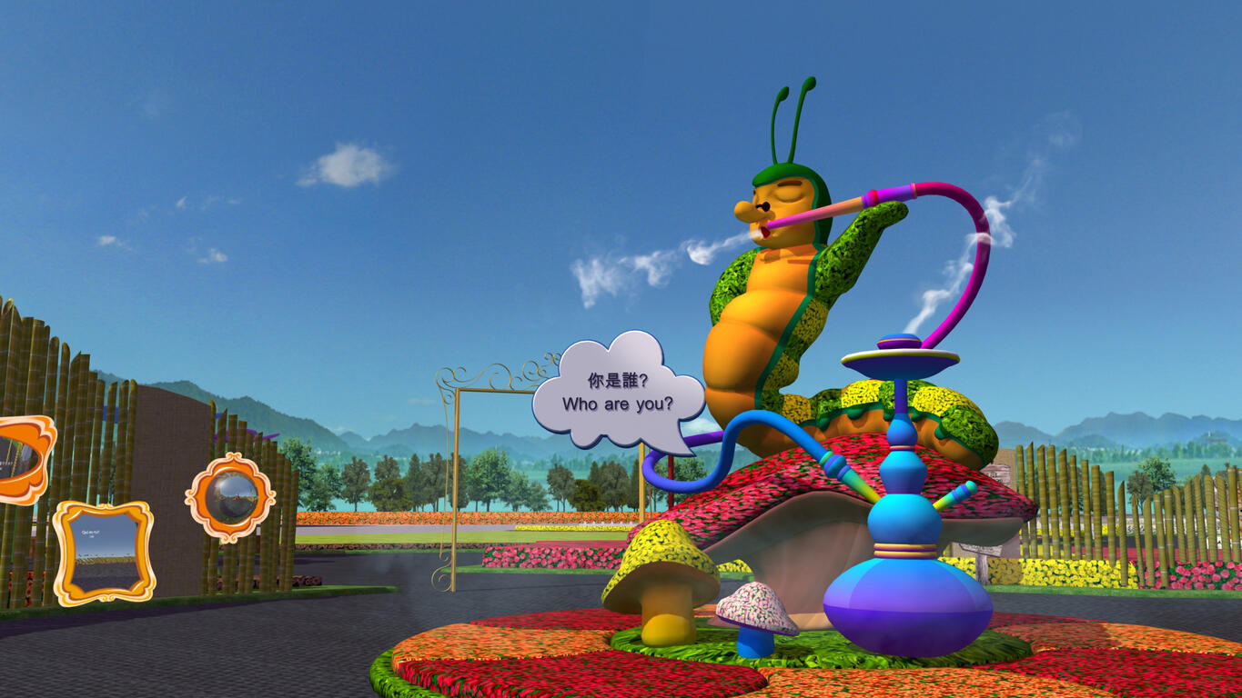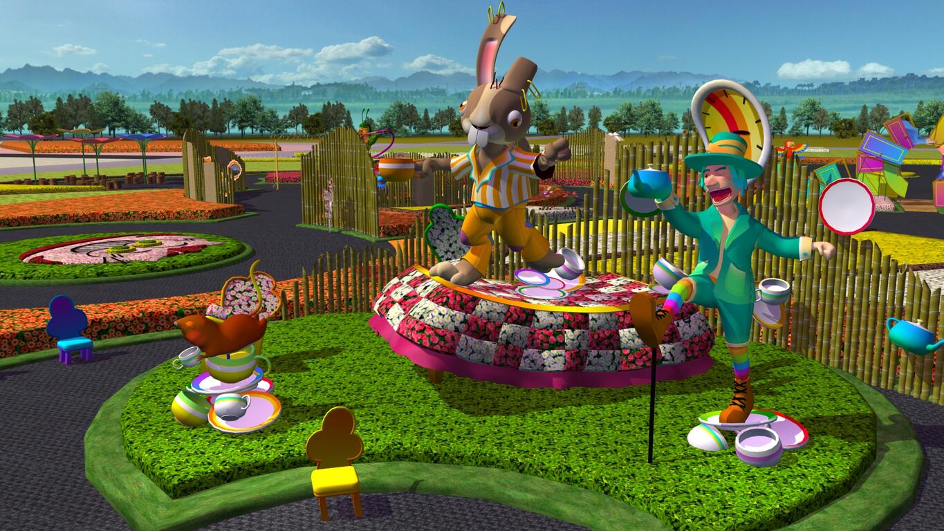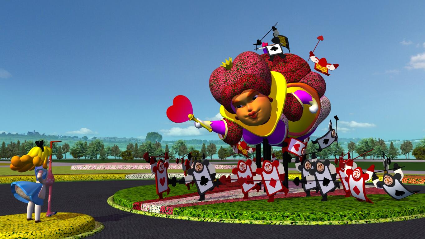 觀旅局指出,主花毯由高10公尺的紅心皇后居高臨下朝著愛麗絲飛來,皇后由一群忠心的撲克牌士兵簇擁著,巧妙呈現愛麗絲勇敢對抗皇后的情節,主花毯秀時間將搭配水霧四射與動態裝置,打造超越想像的探險故事。而其他重要角色如吞雲吐霧的智蟲、瘋狂茶會的帽匠、看著懷錶匆忙趕路的兔子,都將一一現身花毯節展區,帶領遊客體會書中蘊藏的勇氣之路。