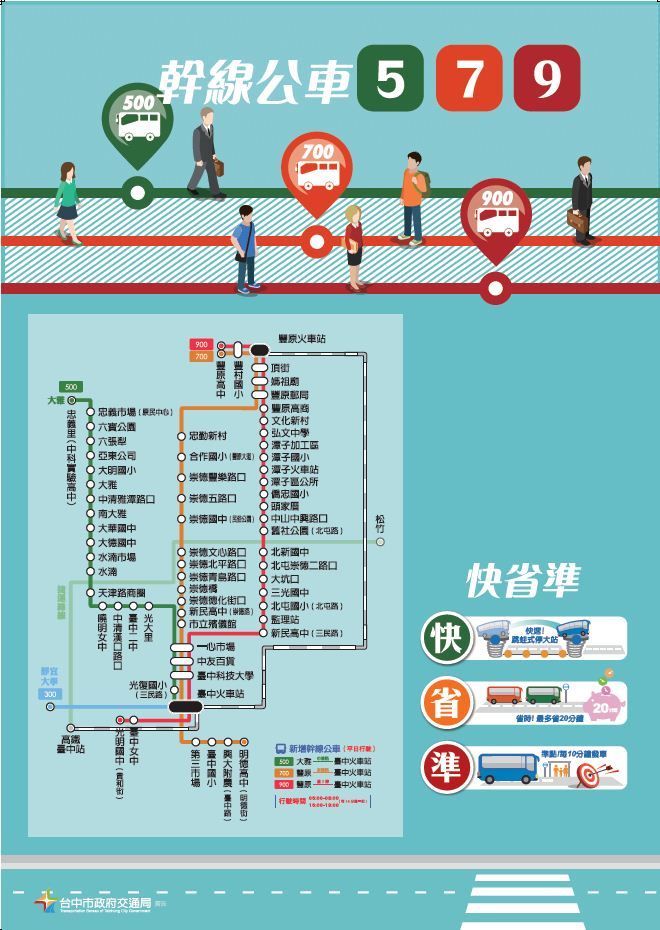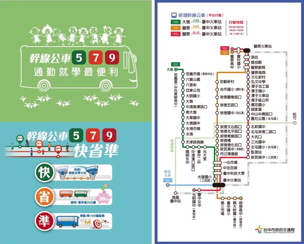 台中市政府新闢579幹線公車今(1)日上午上路,由於採停大站「跳蛙式」行駛方式,縮短載客時間,且每10分鐘就有一班車,不但快速紓解人潮,500路從台中火車站到終點站忠義里(中科實中),較原路線省18分;700路從台中火車站到終點站豐原高中省21分;台中火車站到終點站豐原高中的900路更省27分,顯示幹線公車順利發揮最大效益。