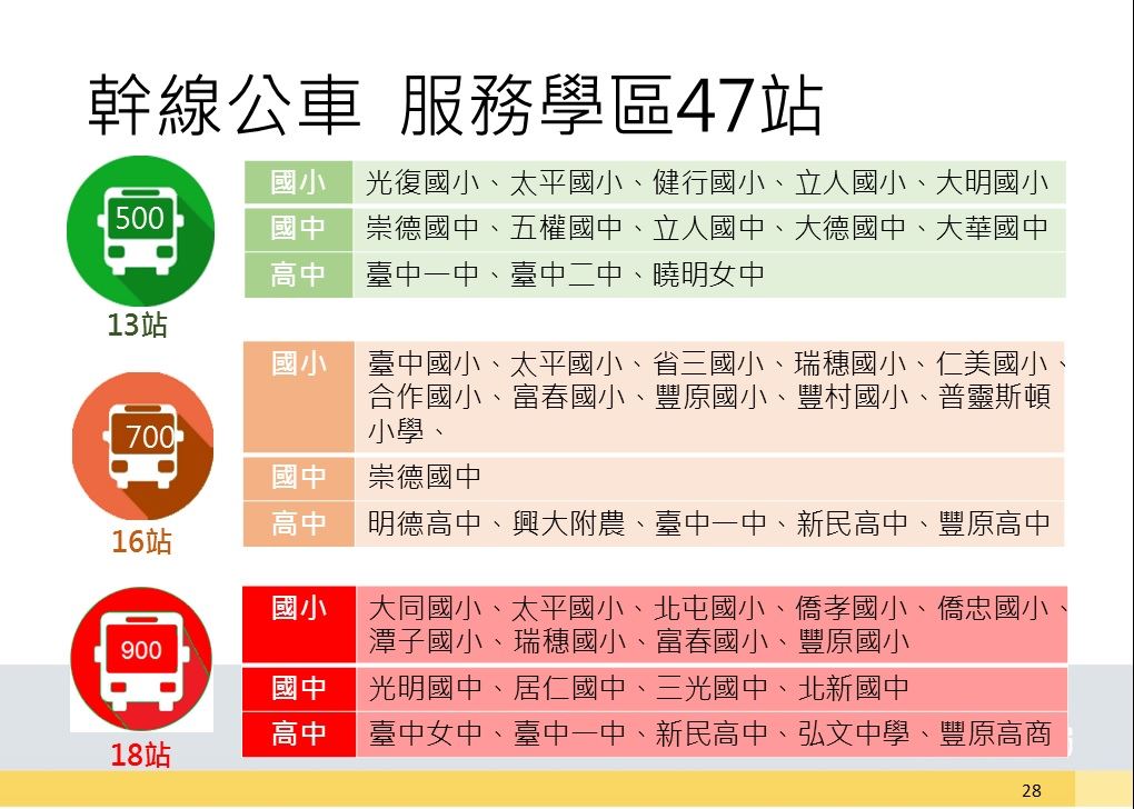 500路、700路與900路幹線公車,分別行駛於中清、崇德及台3省道(北屯路、潭子中山路),尖峰時間每10分鐘一班車,採跳蛙式、停大站方式營運。上路前,交通局多次利用學校朝會時間宣傳,甚至向在路邊等公車的學生說明,希望讓他們更了解這項新措施的便利性。
