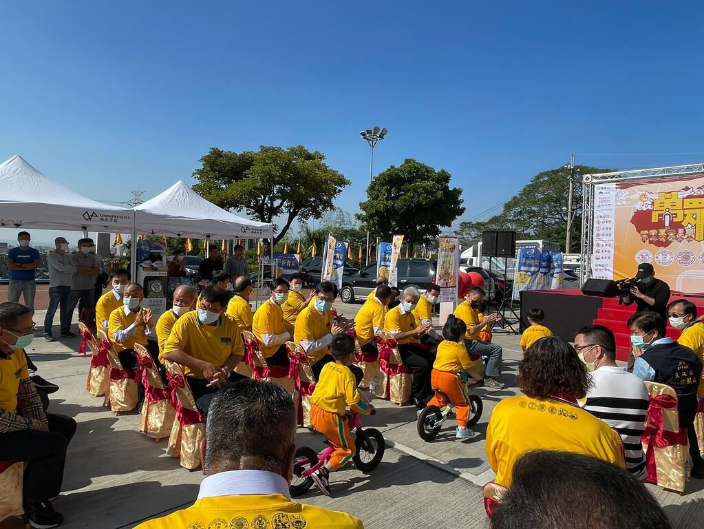 「2021萬眾騎BIKE」活動今(1)日在朝聖宮舉行宣傳記者會,台中市政府民政局副局長徐照山、運動局主任秘書賴東宏、朝聖宮主委李煥湘、鎮清宮副主委楊敬裕、鎮瀾宮董事長顏清標、鎮瀾宮副董事長鄭銘坤、萬興宮主委徐明爐、萬和宮董事長蕭清杰、萬和宮執行長廖志濃、樂成宮董事長郭松益、捷安特總經理鄭秋菊、台中銀行協理李堯天、台中銀行經理張信興、強震科技有限公司董事長高自強及仲強毅科技股份有限公司董事長蘇致銘均到場支持。