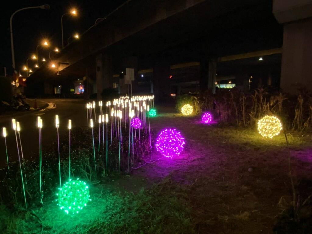 建設局說明,東區湧泉公園(帝國糖廠星泉湖)有栩栩如生的麋鹿拉著雪橇在公園出沒,與湖景相輝互映,營造奇幻的空間感受;豐原火車站後站槽化島展出巨型禮物樹及希望種子,營造藍白風格雪地景緻;車流往來頻繁的台灣大道交流道匝口處前槽化島,以蒔花與造型燈海,讓往來人車在白天或夜晚經過,都能有不同視覺感受。