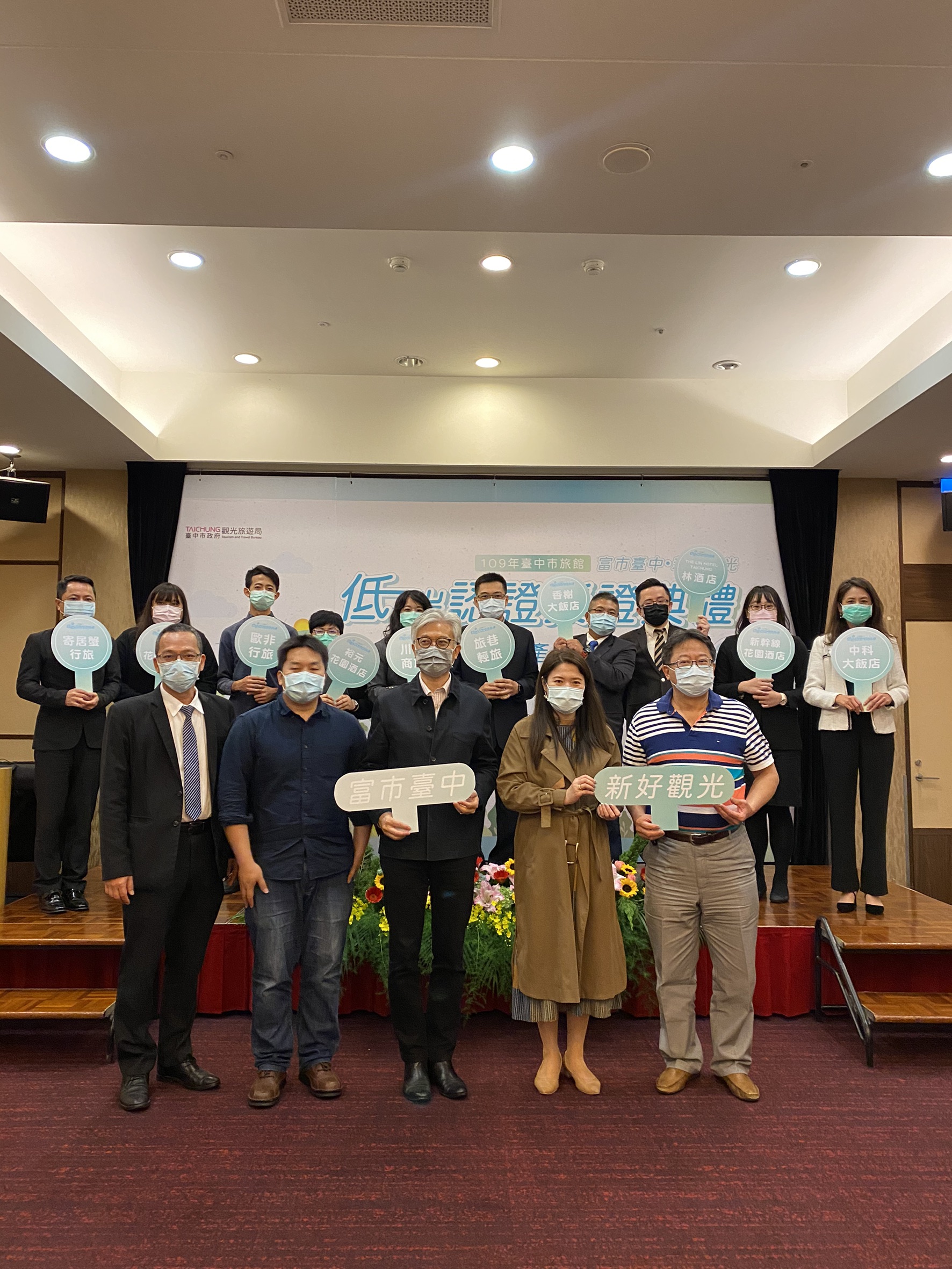 市府為強化低碳品牌意象推廣,於12月26日於草悟道廣場聯合觀光產業舉行授證典禮,臺中國際觀光發展協會柴理事長俊林、中市觀光旅館公會許秘書長志仁、台中市民宿協會陸理事長冠全及本市低碳旅館業者們共襄盛舉,典禮中林局長特別代表盧秀燕市長及市府團隊向與會貴賓致謝,並指出草悟廣場也是我們臺中市推動低碳觀光的一環,是本市的示範區域,期許大家揮別這充滿衝擊的一年,邁向新年,攜手合作度過疫情難關。