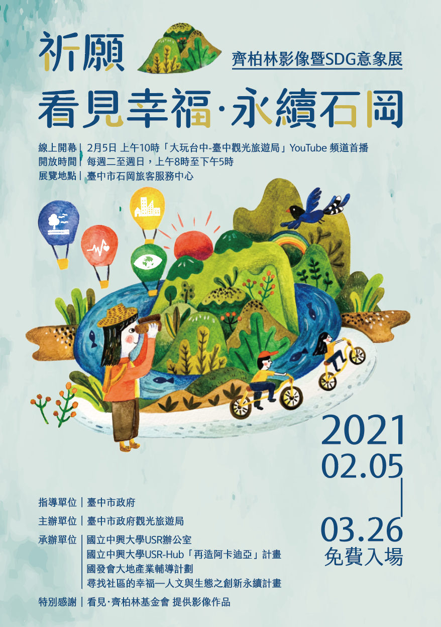為推動永續觀光發展,臺中市政府觀光旅遊局攜手國立中興大學社會責任實踐辦公室,共同策劃「祈願~看見幸福.永續石岡」攝影特展,將於2月5日至3月26日(春節無休館)每週二至週日,在臺中市石岡旅客服務中心展出齊柏林導演「看見福爾摩沙」及「921地震前後」系列作品,觀旅局呼應聯合國SDGs的永續理念,希望透過這些精彩影像紀錄傳遞臺灣與臺中的自然美好讓更多人知道。