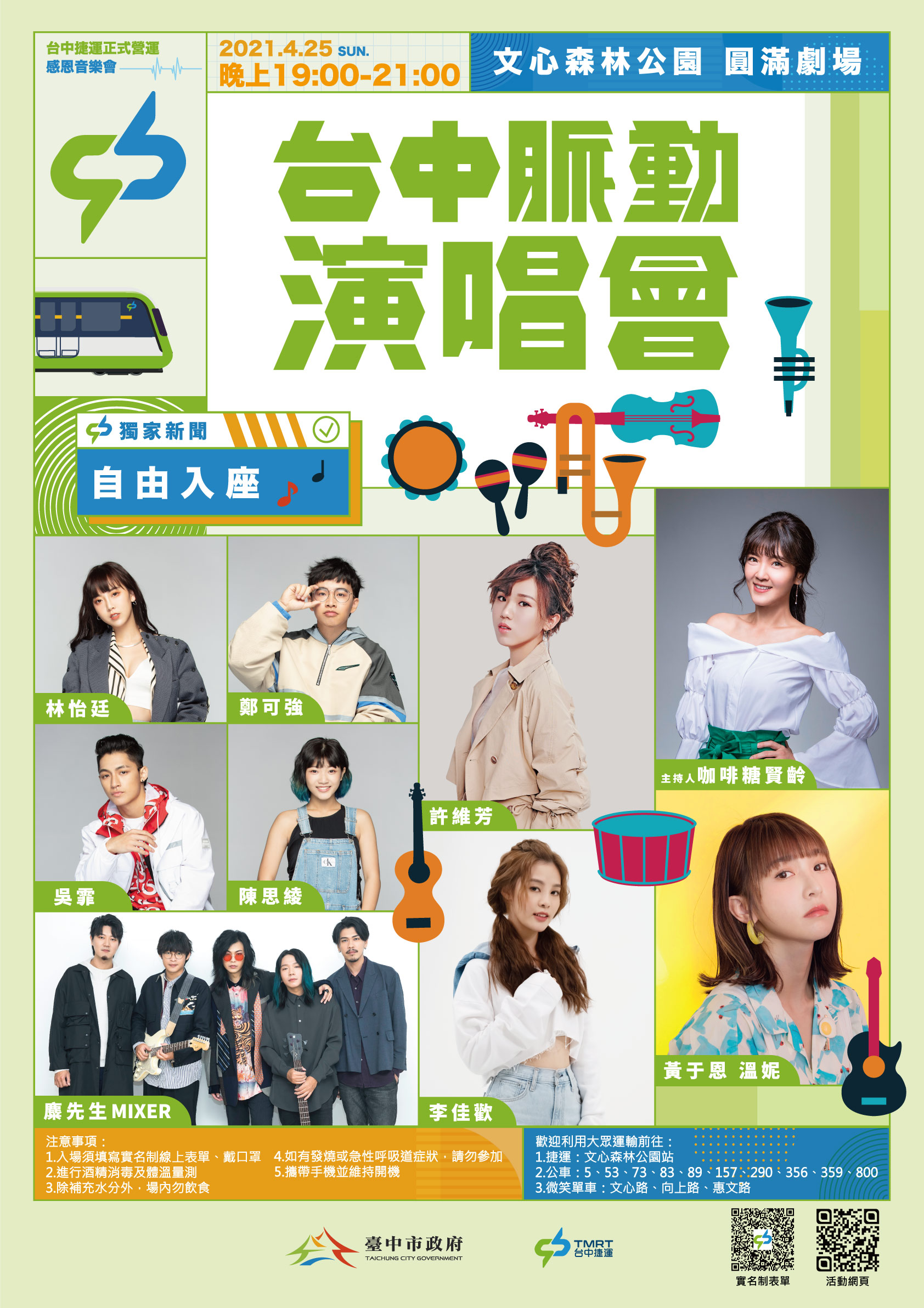 台中捷運公司指出,中捷綠線正式通車象徵中台灣大眾運輸發展邁向新的里程碑,歡迎大家搭乘大眾運輸工具前往演唱會現場,搭乘捷運請在文心森林公園站下車;公車5、53、73、83、89、157、290、356、359、800路都可直達文心森林公園;另公園周邊的文心路、向上路、惠文路也設有微笑單車3站點,歡迎多加利用。因應疫情,入口處將設置紅外線熱像儀測量體溫,備妥酒精消毒,提醒民眾全程戴口罩並填寫實名制表單,現場禁止販售餐飲及飲食,一起守護健康安全。