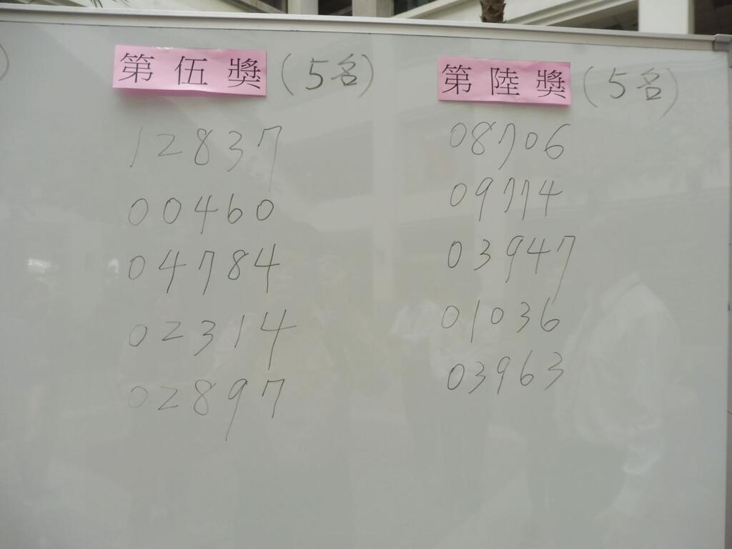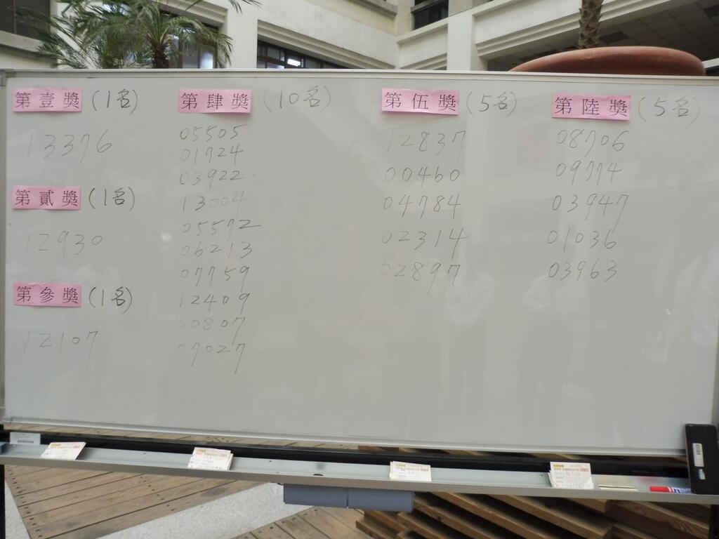 本案活動自民國104年12月29日起至105年2月22日止,活動期間購買后里馬場入園門票1張,即贈送本活動摸彩券1張,憑摸彩券抽大獎,本案活動已結束,於民國105年3月7日下午2時在臺中市政府陽明大樓1樓中廳公開抽獎,邀請本府觀光旅遊局莊主任秘書右孟、張專門委員祐創、政風室陳主任添富、人事室沈主任慧媛抽獎,並邀請本府法制局張百佑消保官做見證,抽獎過程全程公開並錄影及拍照存證,並於臺中市政府觀光旅遊局官網及后里馬場現場公告得獎名單,恭喜以下得獎者幸運獲獎: