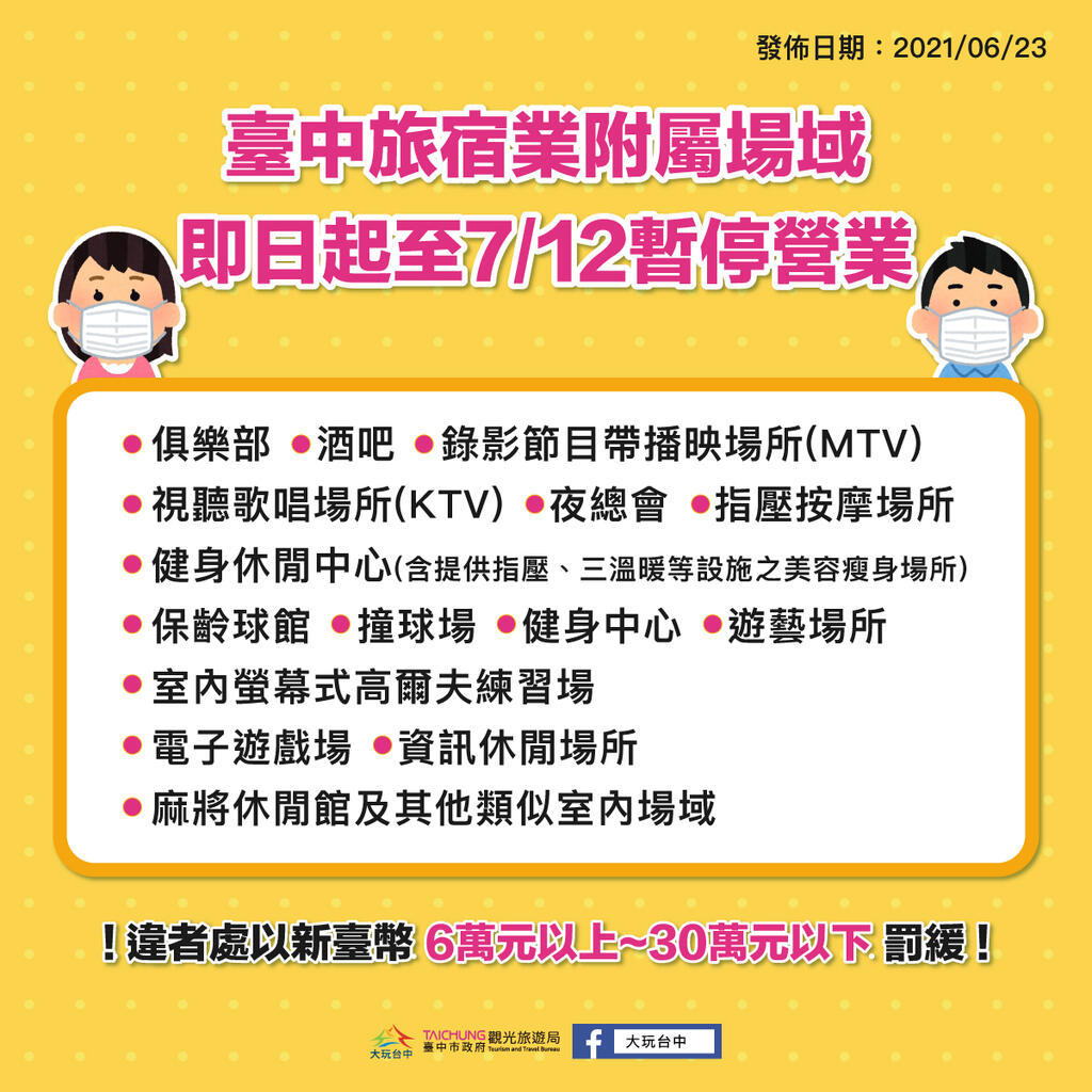 觀旅局補充,為避免造成防疫破口,台中旅宿業附屬場域也持續暫停營業至7月12日,包括俱樂部、酒吧、錄影節目帶播映場所(MTV)、視聽歌唱場所(KTV)、夜總會、指壓按摩場所、健身休閒中心(含提供指壓、三溫暖等設施之美容瘦身場所)、保齡球館、撞球場、健身中心、室內螢幕式高爾夫練習場、遊藝場所、電子遊戲場、資訊休閒場所、麻將休閒館及其他類似室內場域)。請民眾配合暫緩涉足,以確保自身及他人安全,共同為防疫盡一份心力。草悟廣場富地市集暫停營業至110年6月30日,後續將進行內部整理。