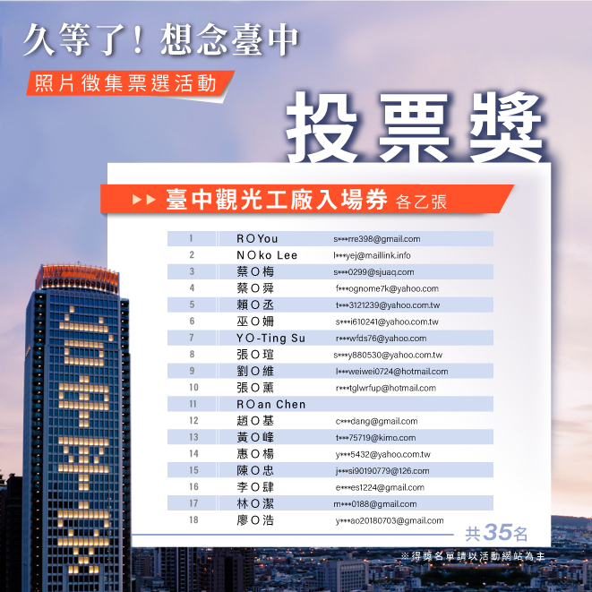 觀旅局表示,詳細得獎名單請上台中觀光旅遊網(https://travel.taichung.gov.tw/ )或大玩台中臉書粉絲團(https://www.facebook.com/taichungresort/ )查詢,並呼籲,疫情期間請民眾務必配合中央流行疫情指揮中心指引,多數景點已有限度開放,但防疫期間仍務必配合相關管制措施,出門全程佩戴口罩、勤洗手、維持社交距離,齊心守護你我健康安全,共同為安全環境盡一份心力。