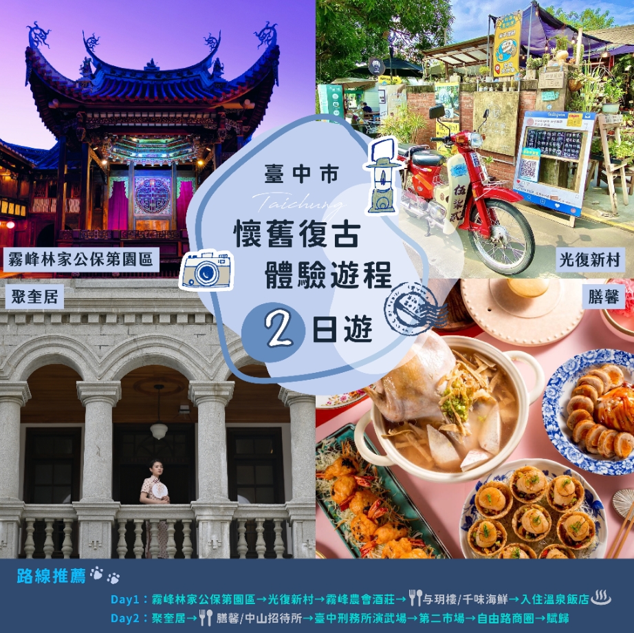 觀旅局指出,「懷舊復古」遊程主打復古風潮,由屯區霧峰林家古宅作為旅程起點,體驗中秋限定博狀元餅活動,順遊台灣第一個古蹟會館-立法院民主議政園區,此地是台灣民主發展史上重要的精神象徵,歷經歲月更迭,建築仍保留原型,民眾在此享用餐點或咖啡可感受台中仕紳文化的復古風味。