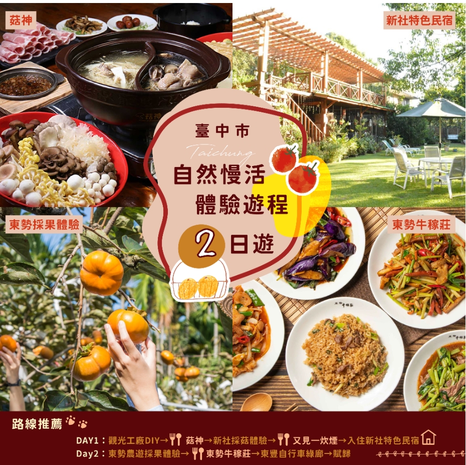 接著前進全台香菇盛產地新社,體驗職人帶路的感動,從採菇、撿拾雞蛋到手作茶碗蒸,是產地到餐桌的真實農事生活體現。夜宿新社特色民宿盡享月光星空伴蟲鳴。隔日探訪水果之鄉東勢,秋季盛產梨、柿,預約親採樂趣無窮,漫遊軟埤坑休閒農業區健康步道、體驗植物染活動,最後以東豐自行車綠廊騎乘自行車作為旅程終點。今年台中山城區域有菇神、牛稼莊及又見一炊煙3家餐廳榮獲米其林指南推薦,不論是各式菇類拿手料理、客家全牛大餐或無菜單料理,舌尖上的感動加深對台中山城的美好記憶。