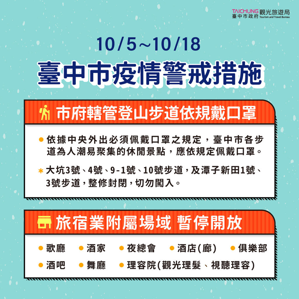 觀旅局呼籲,中市權管登山步道人潮眾多,為確保登山民眾健康安全,民眾登山仍須佩戴口罩;另今日起,大安濱海樂園(含沙灘區)活動也請民眾依循中央防疫指引,隨身攜帶口罩,若無法保持社交距離則應佩戴口罩。出遊時遵守各項防疫規定與措施,勤洗手、保持社交距離,共同維護你我安全。