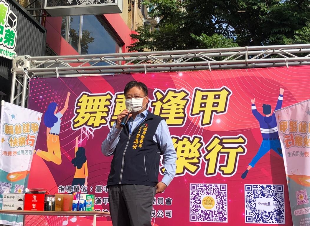 台中市政府經濟發展局輔導台中市逢甲商店街管理委員會今(15)日於逢甲商圈舉辦「舞動逢甲 快樂行」記者會。經發局副局長李逸安表示,即日起至11月21日中午12時前,民眾只要至逢甲商圈拍攝舞蹈短片,就有機會獲得價值5千元的商圈消費券,且於11月21日前購買「9折消費券」滿1000元,還可獲得一張摸彩券抽好禮,歡迎民眾至逢甲商圈住宿、消費。
