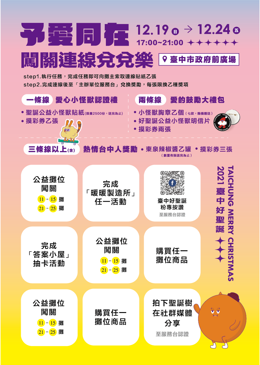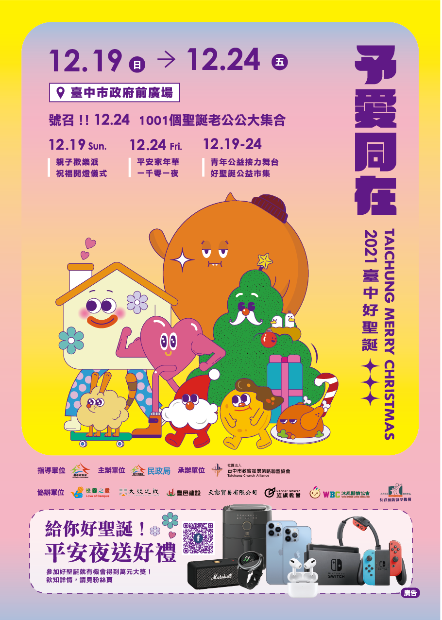民政局說明,由民政局攜手聯合社團法人台中市教會發展策略聯盟協會,及台中市眾教會舉辦的「台中好聖誕-予愛同在活動」,即日起至24日(假日14時至21時、平日17時至21時)展開聖誕公益市集,還有不間斷的青年公益舞台表演。此外,現場還有各類文創商品、精緻小物、甜點、茶品、飾品等販售,各攤商也會捐出營業額20%給關懷弱勢的社福團體,歡迎市民朋友踴躍參加,除能感受歡樂聖誕氣息,還可一同做公益,將溫暖的愛心送給城市中各個族群與角落。