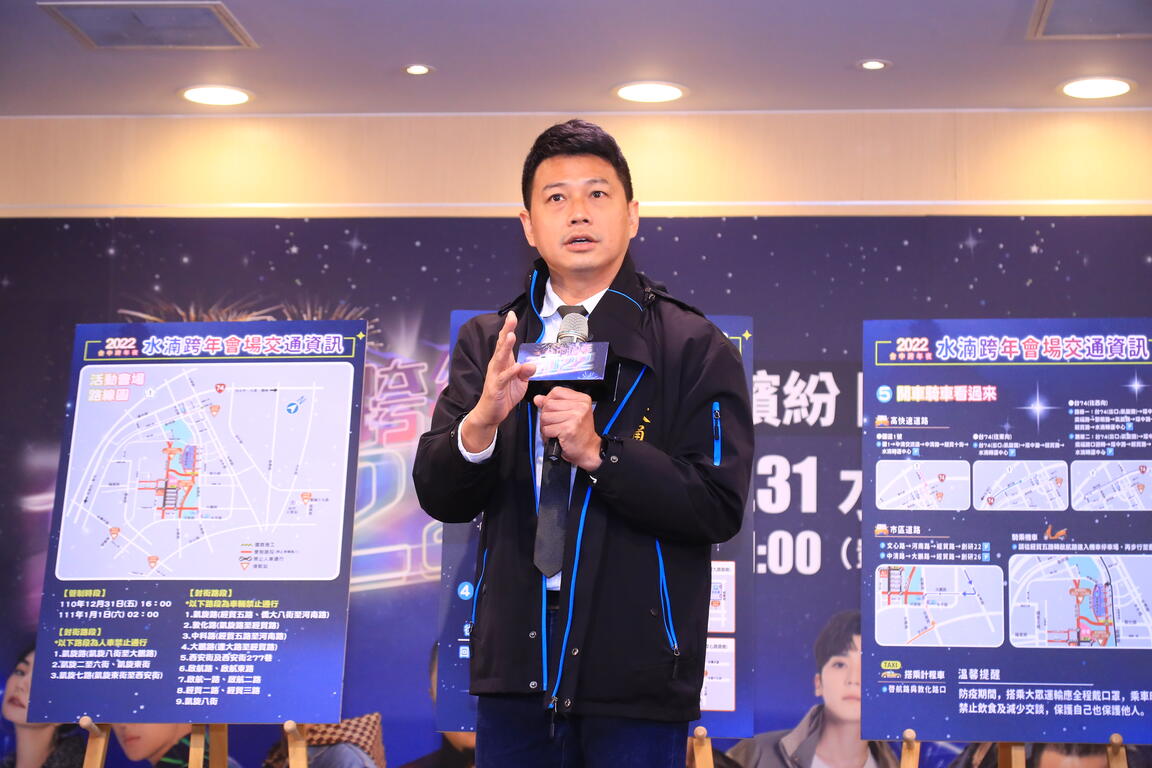 在交通方面,交通局長葉昭甫指出,市府規劃4條免費接駁車路線,分別為秋紅谷線、市政府線、松竹線及北水湳線,各接駁站往會場的發車時間為31日晚間5時至11時30分;回程發車時間為晚間10時至隔天凌晨1時30分,班距約10至15分鐘一班,坐滿即發車,此次也是中捷綠線通車後第一次跨年活動,歡迎搭乘捷運、台鐵、公車等大眾運輸工具,再轉乘免費接駁車至會場,交通資訊歡迎至台中跨年網站(https://taichungnewyear.com.tw/2022/traffic.html )查詢。