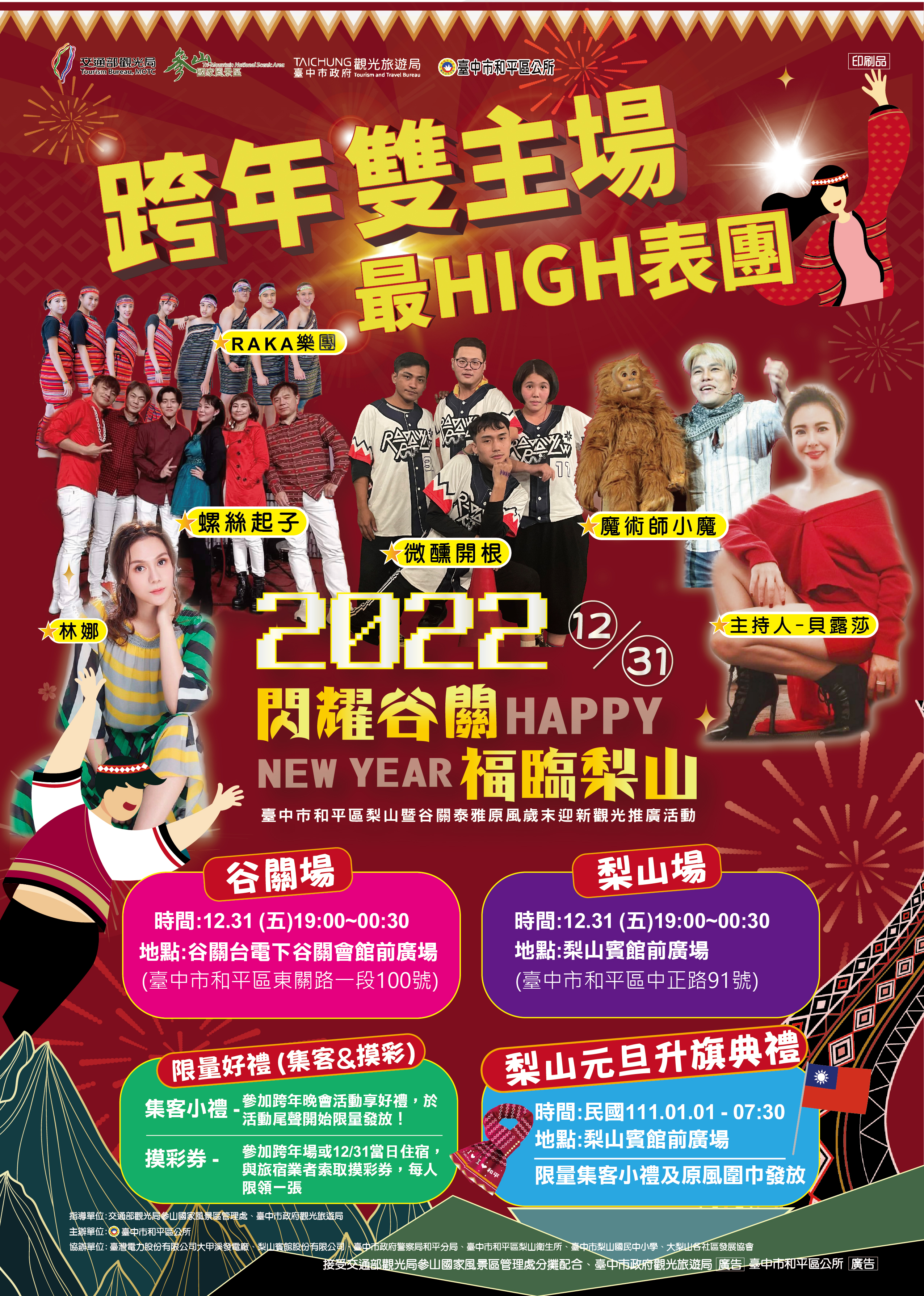 和平區長吳萬福表示,跨年晚會12月31日晚上7時開放入場,谷關場在「谷關台電下谷關會館前廣場」舉行,現場邀請螺絲起子樂團、阿樂大氣球、微醺開根、泰好玩、哈斯哈斯樂團;梨山場在「梨山賓館前廣場」由梨山國民中小學、山羊樂團、資給力樂團、魔術先生小魔,還有選秀新星林娜陪您一起狂歡迎接2022年。和平區公所貼心準備暖心熱湯和薑茶,讓民眾不畏寒冷,還有在入場時可直接索取限量螢光棒及LED飾品。