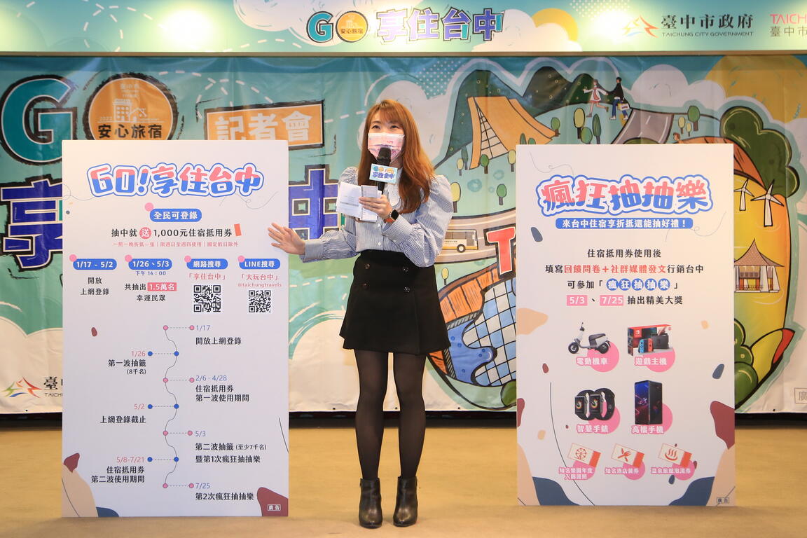 振興國旅自由行市場,台中市政府觀光旅遊局與安心旅宿業者合作,舉辦「GO!享住台中」活動,預計抽出1.5萬份價值1,000元平日住宿抵用券,副市長黃國榮表示,搭配中央振興五倍券與超過百家旅宿業者加碼優惠,以自由行旅客為對象,1月17日起全台民眾皆可上網登錄參與抵用券抽獎,預計於1月26日抽出8,000份,5月3日抽出7,000份,安心旅宿享住台中。