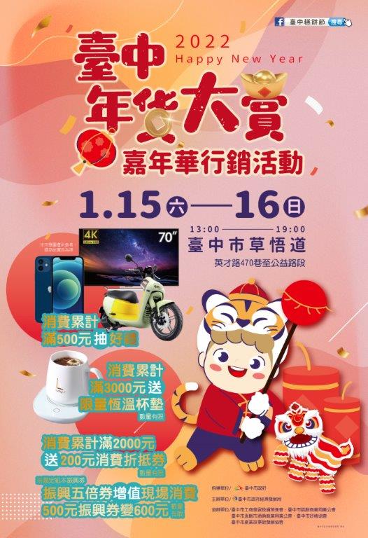 經發局補充,為刺激現場買氣,在2022年有個吉祥如意開端,特別規劃「消費滿2000元送200元消費折抵券,每日限量200名」滿額優惠;消費滿500元,就可參加摸彩,包括Gogoro機車5台、iPhone手機4支、70吋液晶電視2台都有機會帶回家;累計消費滿3000元,直接兌換限量冬日暖心贈品「智能感應恆溫杯墊」。