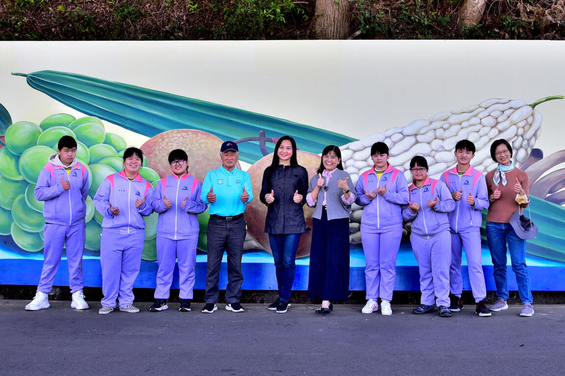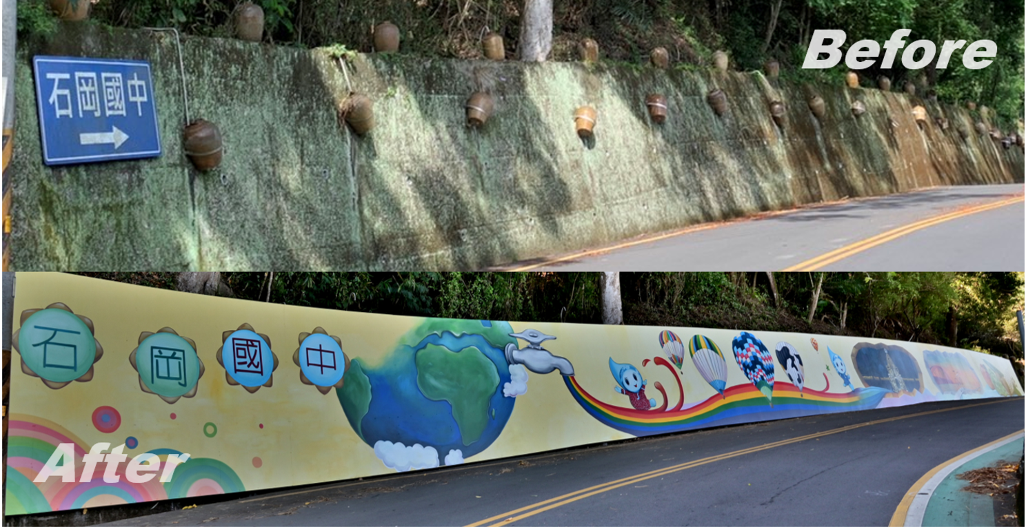 梅子里長郭光勇及石岡國中校長廖玉枝也讚許石岡區公所美化擋土牆,郭里長表示,國中巷擋土牆老舊斑駁佈滿青苔,他便建議公所透過創意彩繪美化,非常感謝公所採納建言,把石岡特色行銷出去;廖校長也感謝劉區長在通往學校的路上給予美麗的彩繪牆,讓學生在轉彎處遇見石岡的美好。