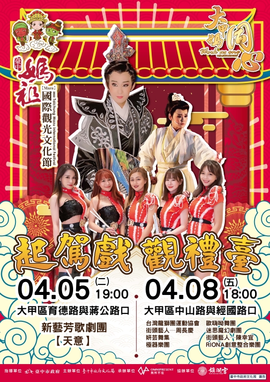 文化局表示,大甲媽祖遶境進香已登錄為台灣重要民俗活動,是全台最重要的宗教盛事之一,今年配合媽祖遶境和農曆3月媽祖誕辰,4月5日晚上7時在大甲區蔣公路及育德路口演出「起駕戲」,邀請成立已40年的新藝芳歌劇團演出新編劇碼《天意》,劇情描述天上聖母為阻止龍王闖禍而引起的一系列風波,龍王也因此被玉帝打入凡間反省,除透過戲劇感謝媽祖在疫情間的庇佑,也盼帶給民眾生活新的省思。