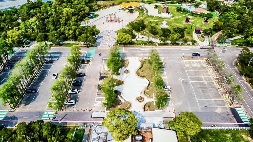 此次工程採用生態工法打除之前硬質舖面改採透水鋪面,透過增加種植綠色植物,苦楝、馬蹄金、過江藤等綠化景觀設計,增加民眾停車舒適感。另外也將部分停車空間重塑為行人專用廣場,配合未來大甲鐵砧山旅服中心OT委外營運,活絡空間效益,提升鐵砧山風景特定區整體休憩品質。