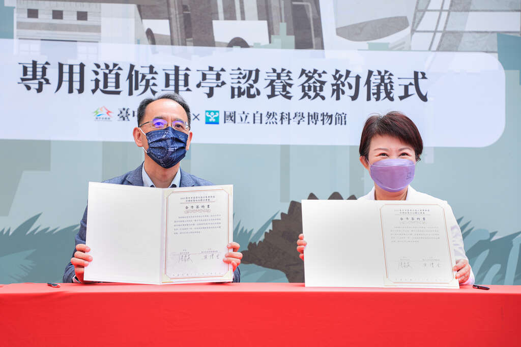 台中市政府積極推動公車候車亭及專用道站體活化,首次邀請國立自然科學博物館參與認養台灣大道公車專用道「科博館站」雙向共2座站體,站體內外彩繪,結合侏儸紀史前風格,帶領民眾走進科學人文的奇妙世界。今(6)日舉行認養簽約儀式,市長盧秀燕表示,科博館於2站體共繪有6隻恐龍,恐龍是科博館重要的象徵,相信未來科博館站會成為全台灣最受喜歡的候車亭,歡迎大小朋友來台中探索參觀。