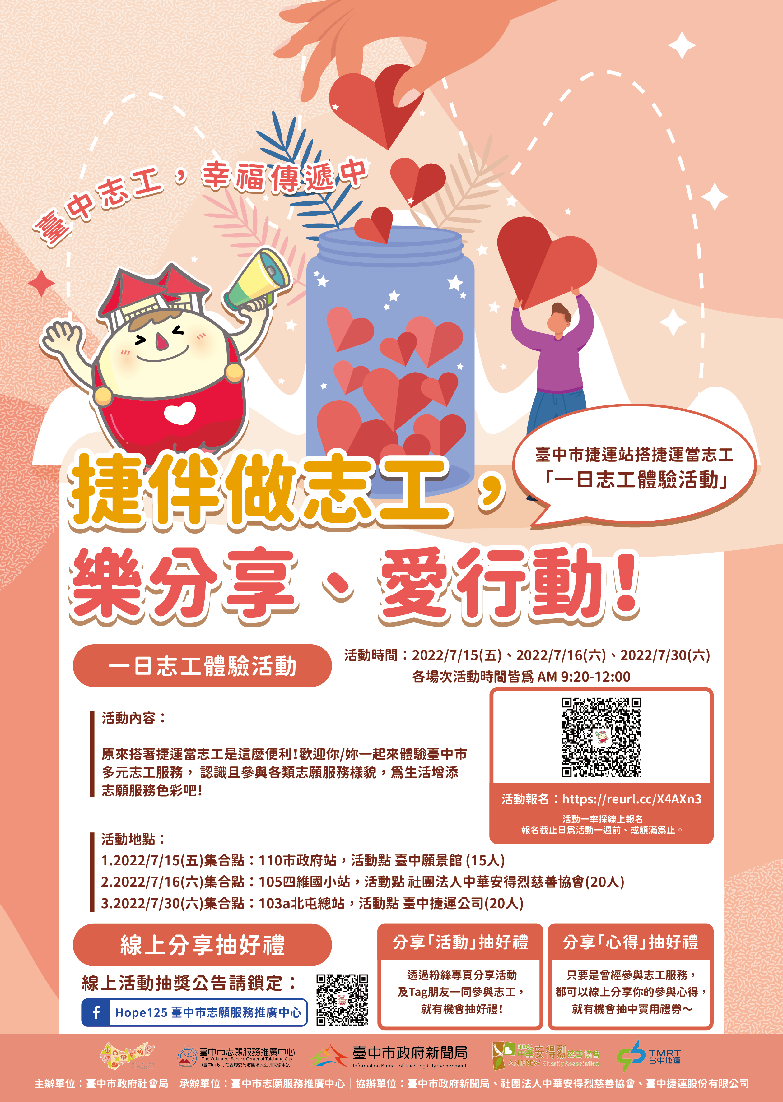 為持續推廣本市志願服務,邀請市民積極參與志願服務, 社會局於111年規劃辦理3場次「搭捷運當志工:一日志工體 驗活動」,期待透過市民體驗不同類型志願服務,進而投 入志願服務,辦理場次如下: