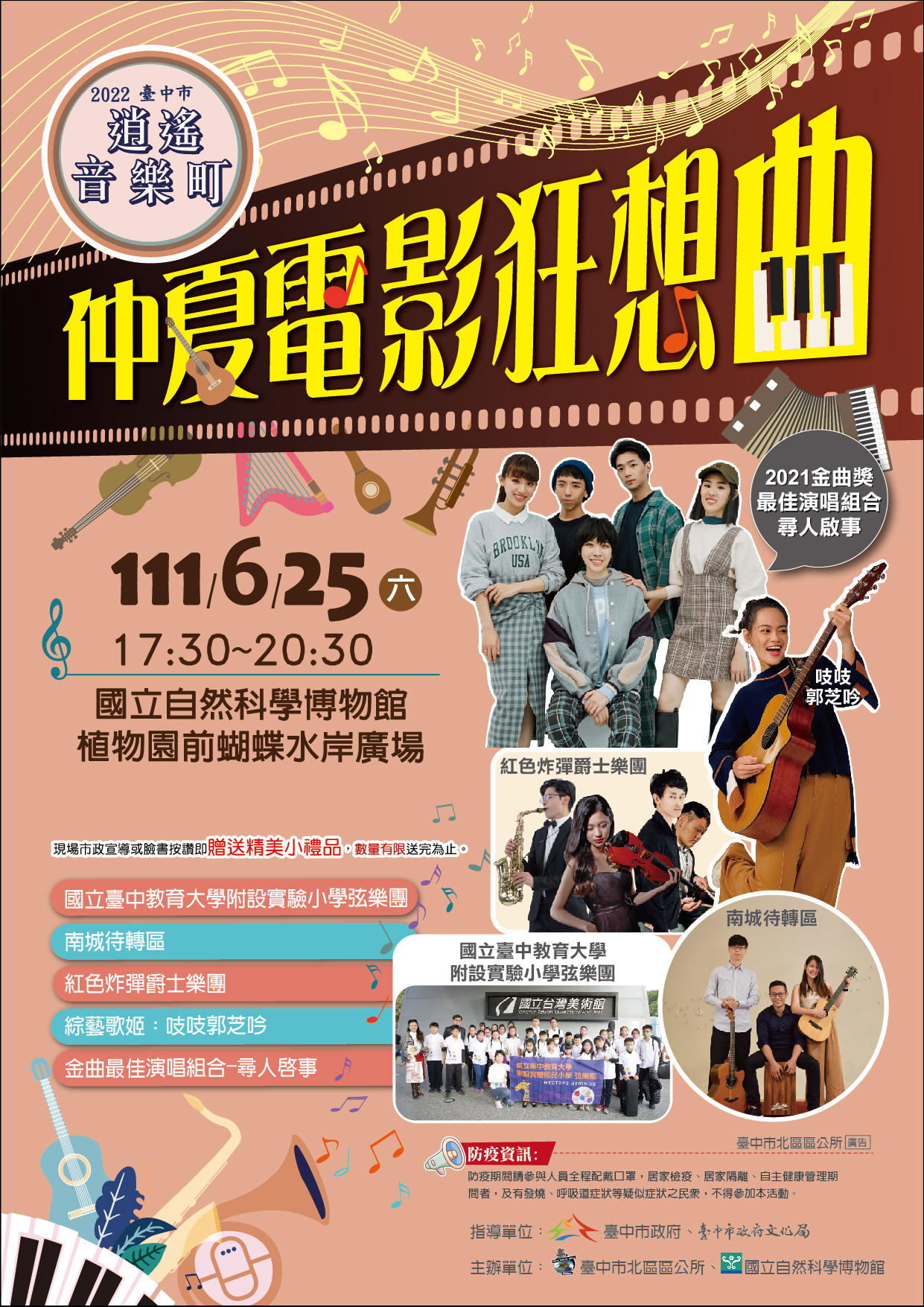 壓軸場次則由北區於下午5點30分帶來「仲夏電影狂想曲」,北區公所今年首次與科博館合作舉行逍遙音樂會,其特別嚴選1980至2020各年代具代表性且點閱率破百萬的電影主題曲和動人曲目,並邀請金曲獎最佳演唱組合尋人啟事、歌手郭芝吟(吱吱),還有紅色炸彈爵士樂團及南城待轉區等重新演繹經典,帶領民眾一起進入電影的時光隧道。