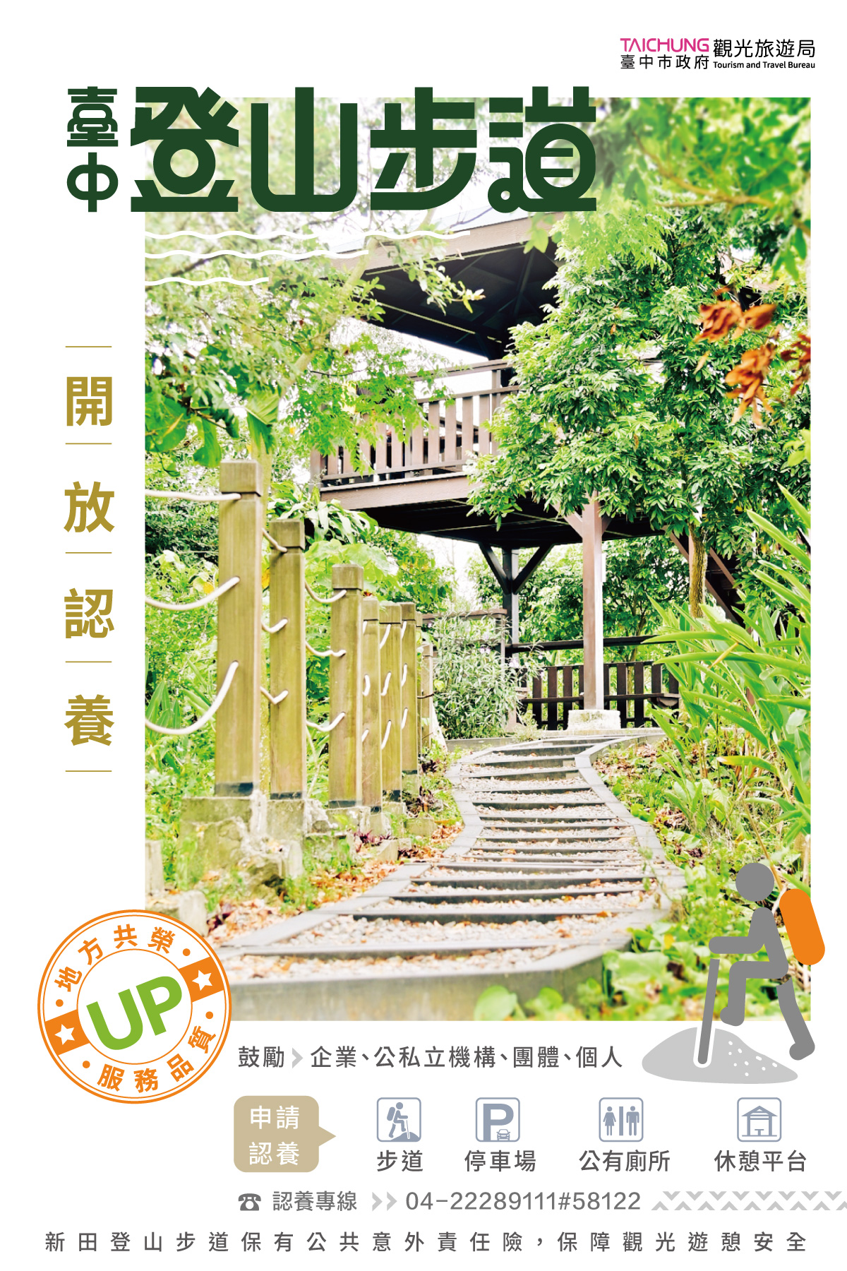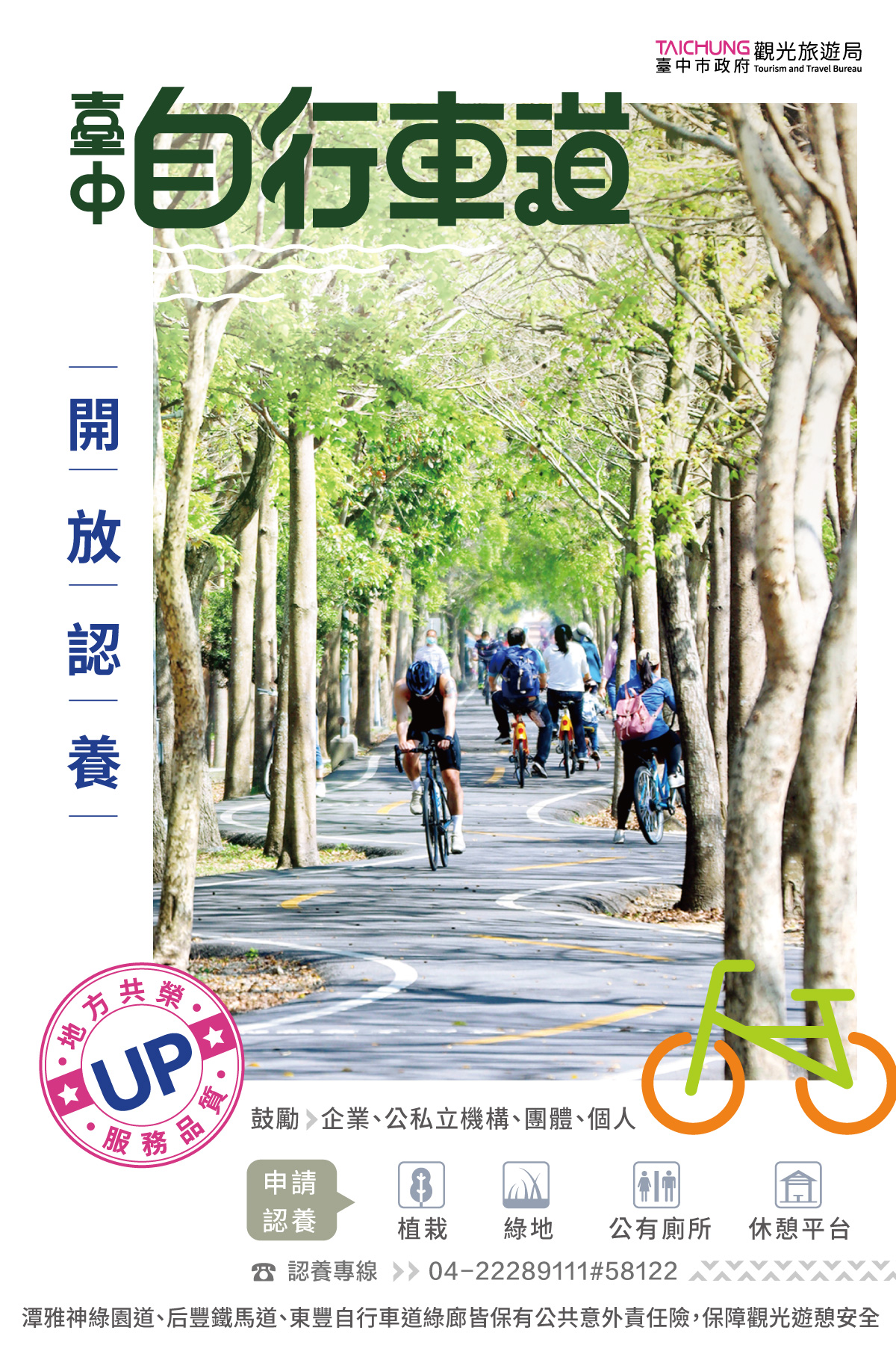 台中市政府觀光旅遊局為維護公共遊憩設施、環境整潔及提升遊憩品質,開放企業及團體認養自行車道及登山步道,呼籲各界共同響應,目前全市29個行政區,已建置97條自行車道與57條登山步道,從山線、市區到海岸線,有適合賞景、健行及登山活動等,提供多元路線,讓遊客依興趣和體能來選擇,目前尚有多處路段開放認養,歡迎申請。