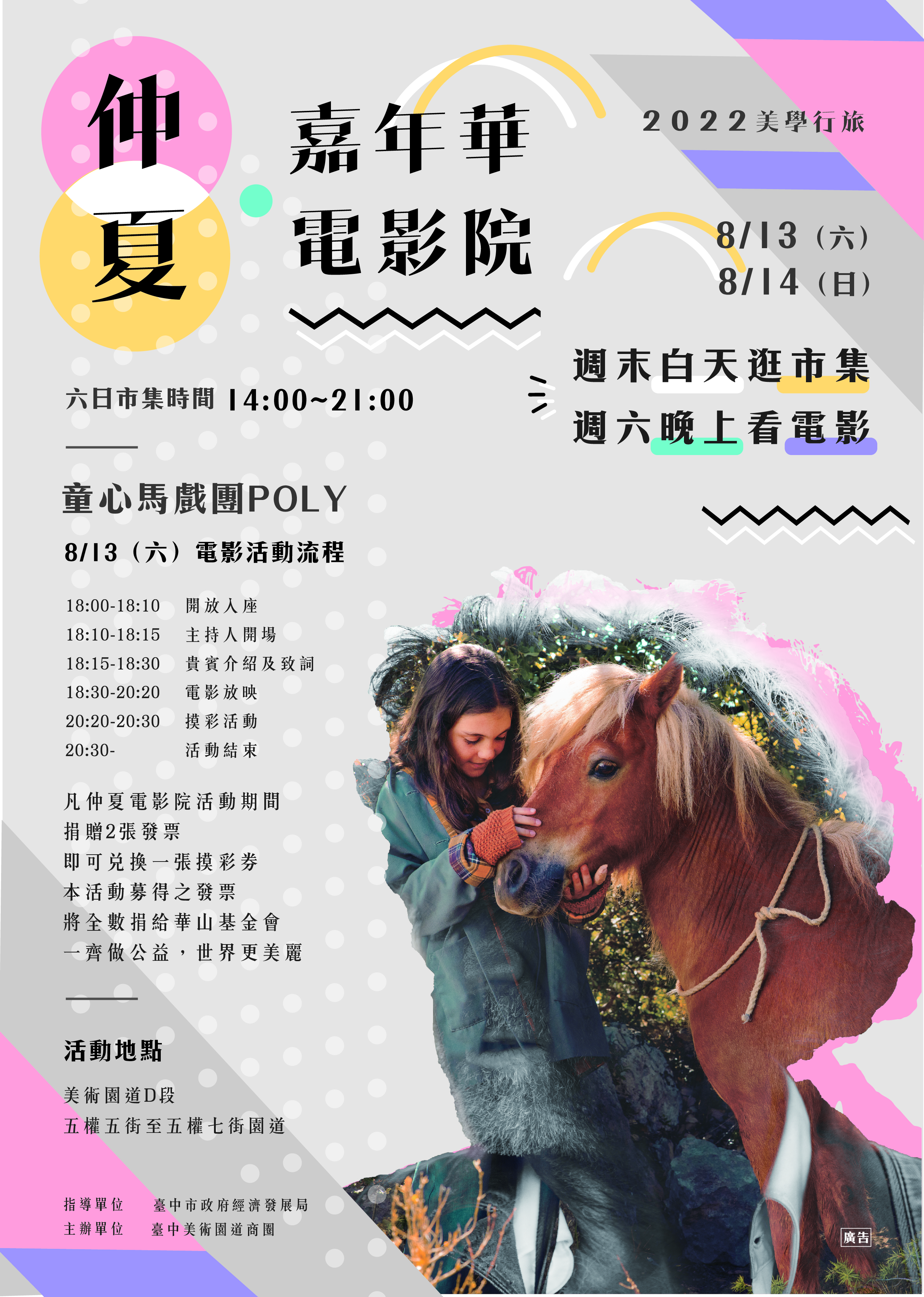 台中市政府經濟發展局輔導美術園道商店街管理委員會明(13)日下午6時,在美術園道D段舉行「2022台中美術園道商圈-美學行旅‧仲夏嘉年華」首部曲「仲夏電影院」,播放電影「童心馬戲團」,講述一位小女孩與小馬波力,為了逃離馬戲團而展開一場充滿驚喜與冒險的旅程,現場也設有文創公益市集,歡迎民眾參加。