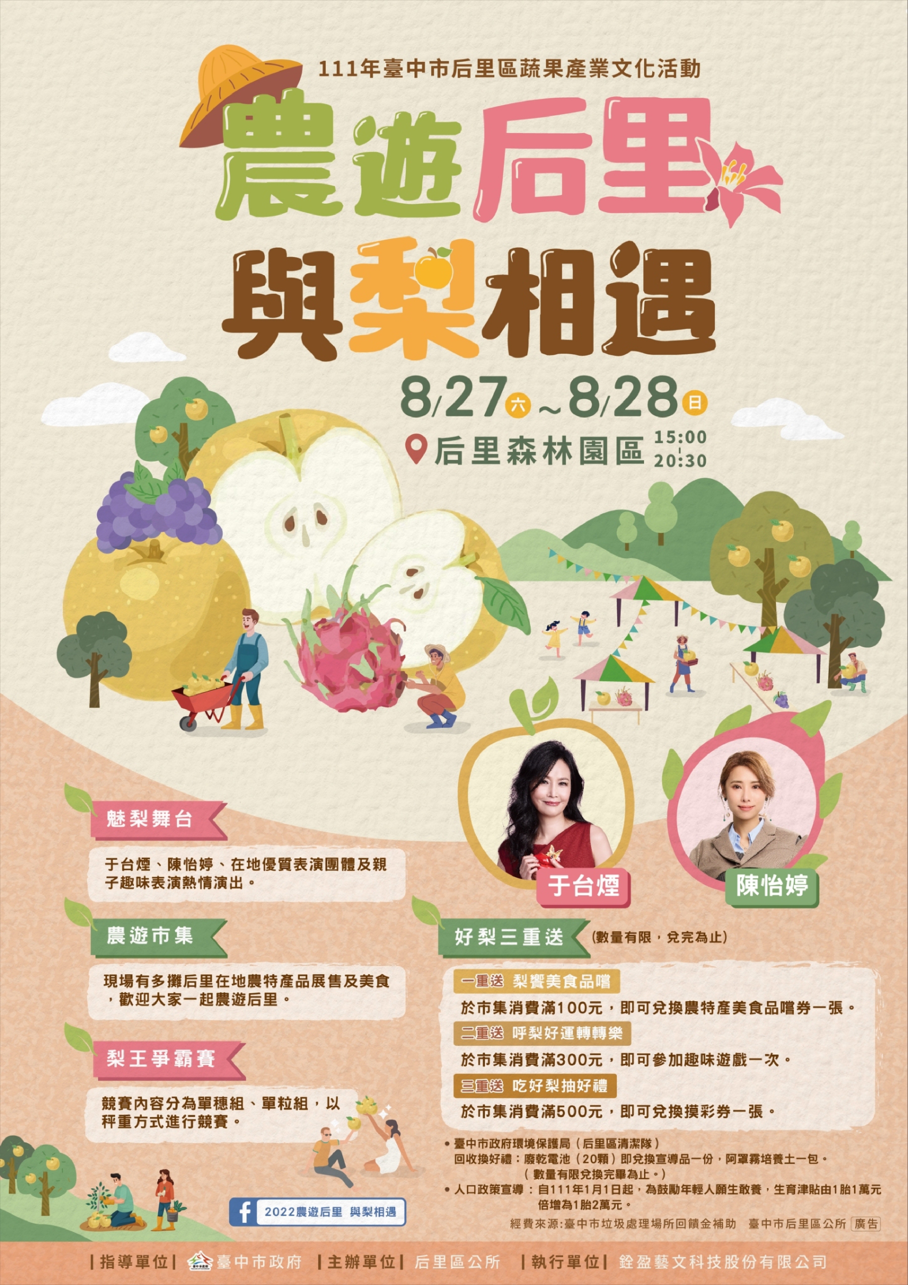 后里區蔬果產業文化活動-農遊后里.與梨相遇,訂於111年8月27、28日,於后里森林公園(臺中市后里區大山路)舉辦。