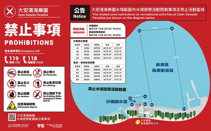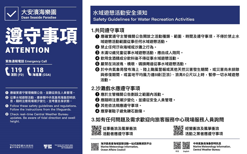 觀旅局表示,大安濱海樂園擁有全台中獨一無二的濱海沙灘,現場均有公告相關水域安全規定及豎立警告牌,並聘請合格水域救生員在旁戒護,在炎熱的暑假期間,讓遊客可以安心戲水,也請遊客務必遵守水域遊憩活動公告事項及救生員指示。
