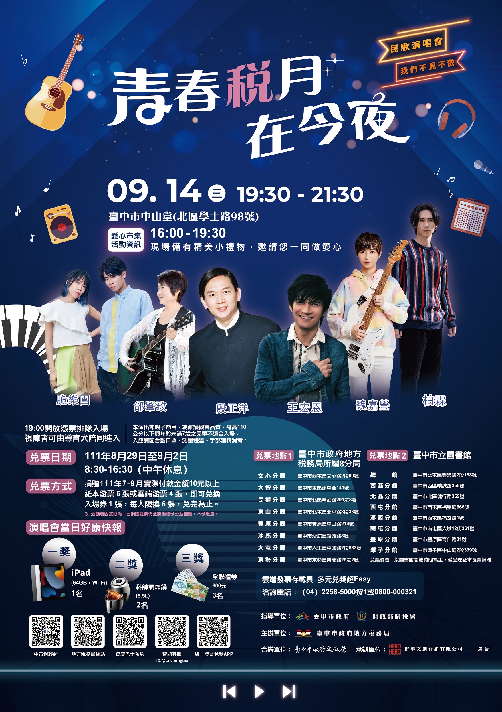 為宣導市政、輕稅簡政措施及推廣雲端發票政策並響應社會公益,台中市政府地方稅務局將於9月14日晚上7時30分,在台中市中山堂舉辦「青春稅月 樂在今夜」民歌演唱會,邀請脆樂團、魏嘉瑩、邰肇玫、柏霖、王宏恩及殷正洋同台演唱,民眾只要在8月29日起至9月2日止,到地稅局各分局或指定圖書館,捐贈今年7月至9月紙本發票6張或雲端發票4張,即可兌換入場券1張,募得發票將全數捐贈給台中市慈善機構,歡迎民眾共襄盛舉,響應社會公益。