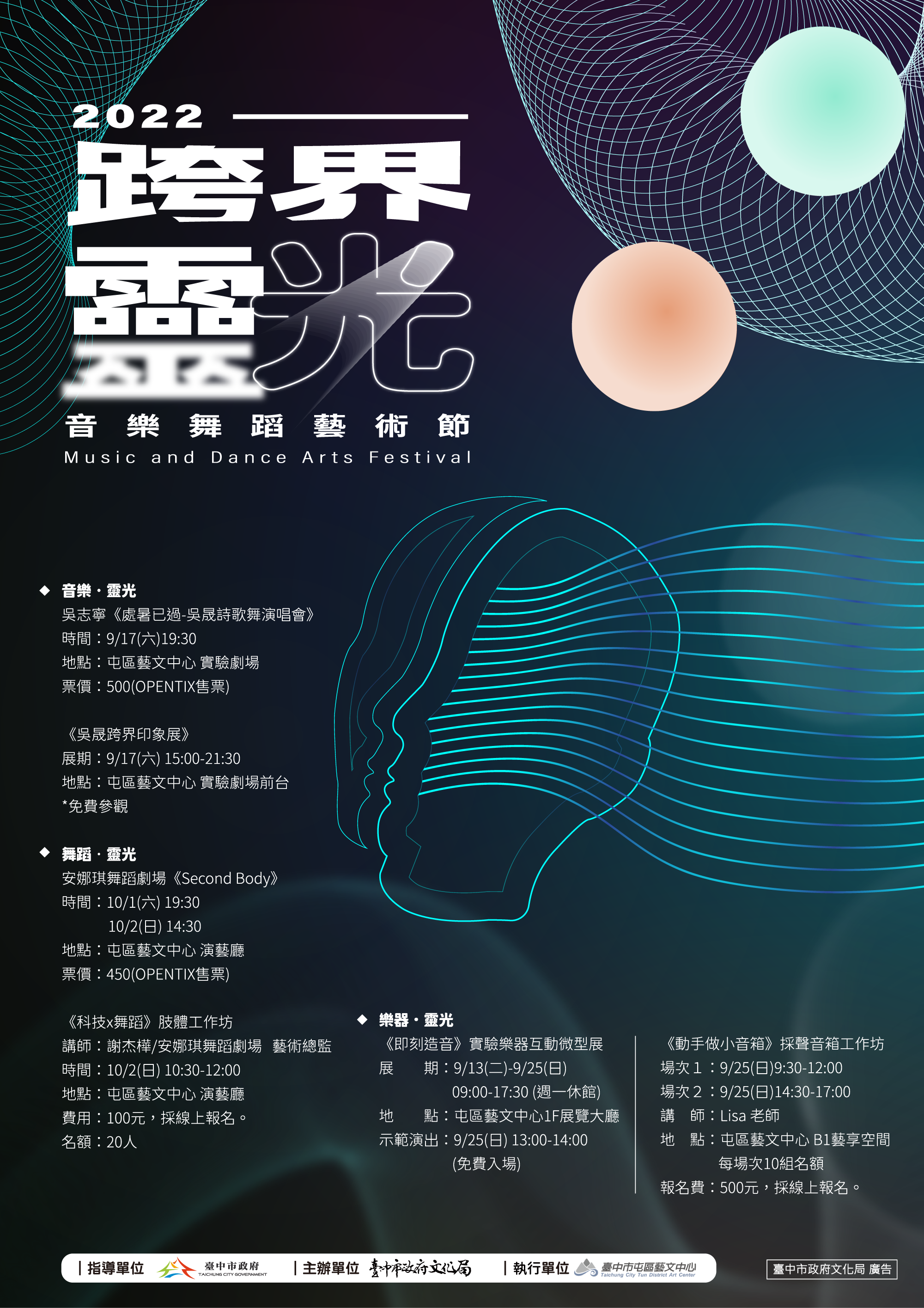 「2022音樂舞蹈藝術節」9月13日起跑!台中市屯區藝文中心表示,今年以「跨界˙靈光」為主題,邀請金音獎入圍歌手吳志寧、TAIWAN TOP演藝團隊「安娜琪舞蹈劇場」與實驗聲響創作團隊「一公聲藝術」等團隊,帶來3場演出、2檔展覽與2場工作坊,呈現文學詩歌、科技舞蹈及實驗樂器裝置等精采跨界展演,即日起開始售票及開放活動報名,歡迎民眾把握機會參加。