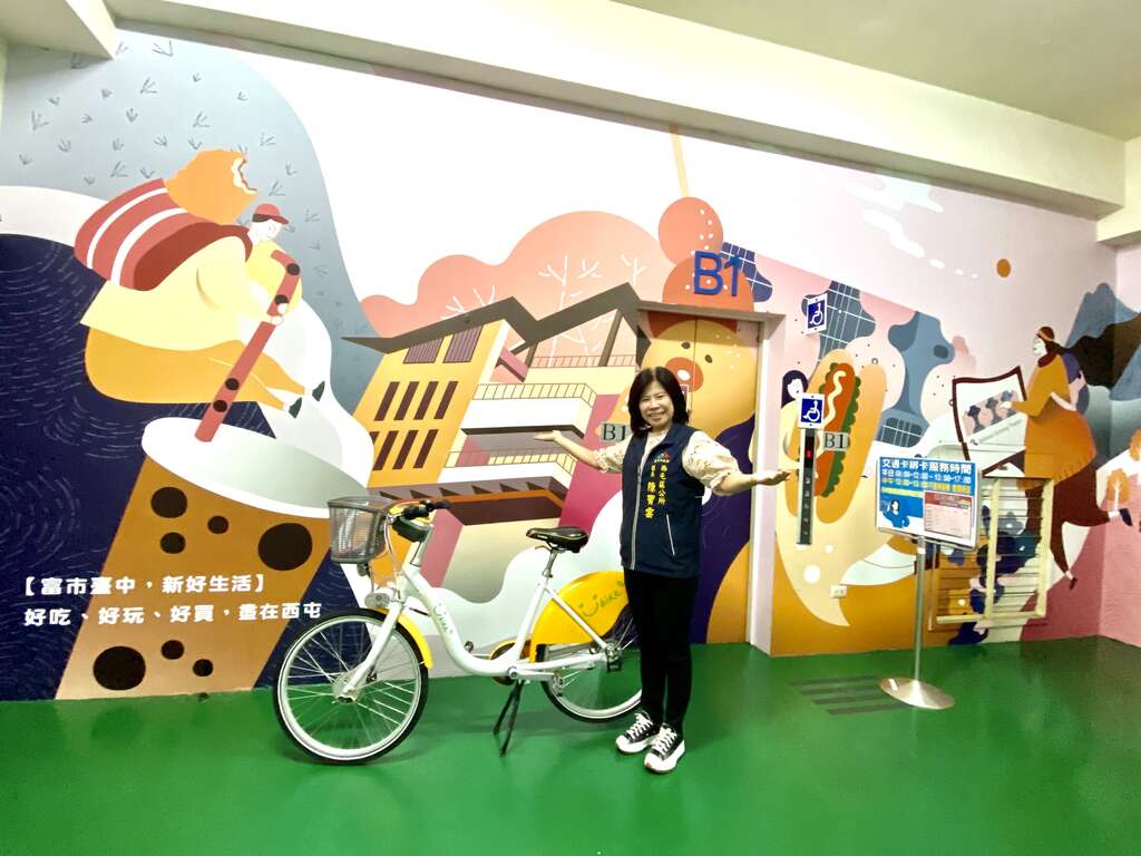 「歡迎騎乘YouBike輕鬆遊西屯!」西屯區陳區長說,台中市是六都第一個導入電動輔助車的城市,騎乘電力輔助更輕鬆、省力,為讓洽公民眾或新遷入西屯區的民眾,更加認識西屯區的景點,特別設計整面牆的超級地圖。