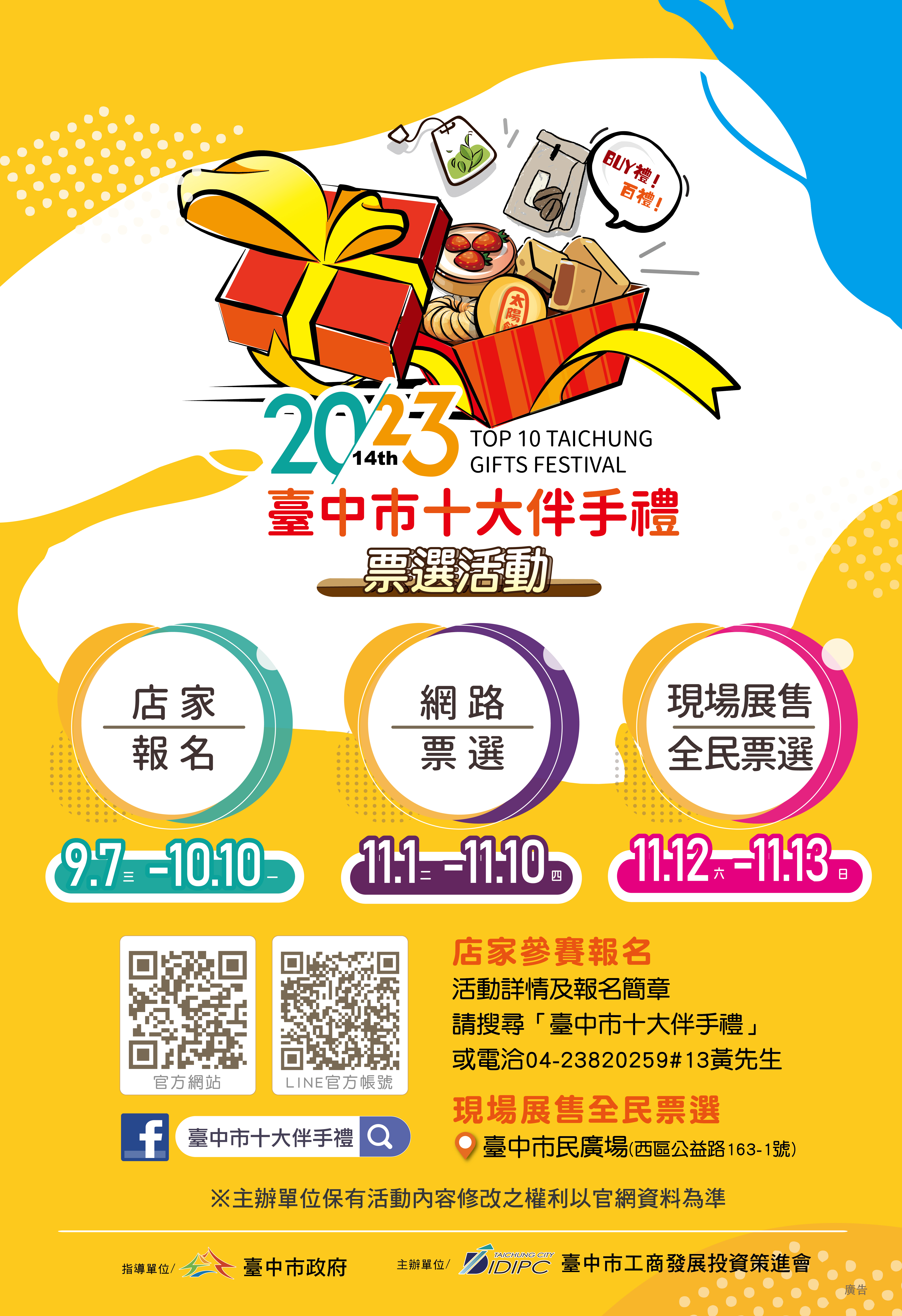 「2023第十四屆臺中市十大伴手禮」票選活動今(7)日開放網路報名徵件,收件截止至10月10日,台中市工商發展投資策進會公布這屆活動主題「Buy禮百禮」,廣邀在地優質伴手禮店家參與徵選,並預告11月1日起將結合「臺中購物節APP」開放民眾網路票選,歡迎民眾踴躍投票,將心意化作實際消費力,把台中的百大好禮都買回家!