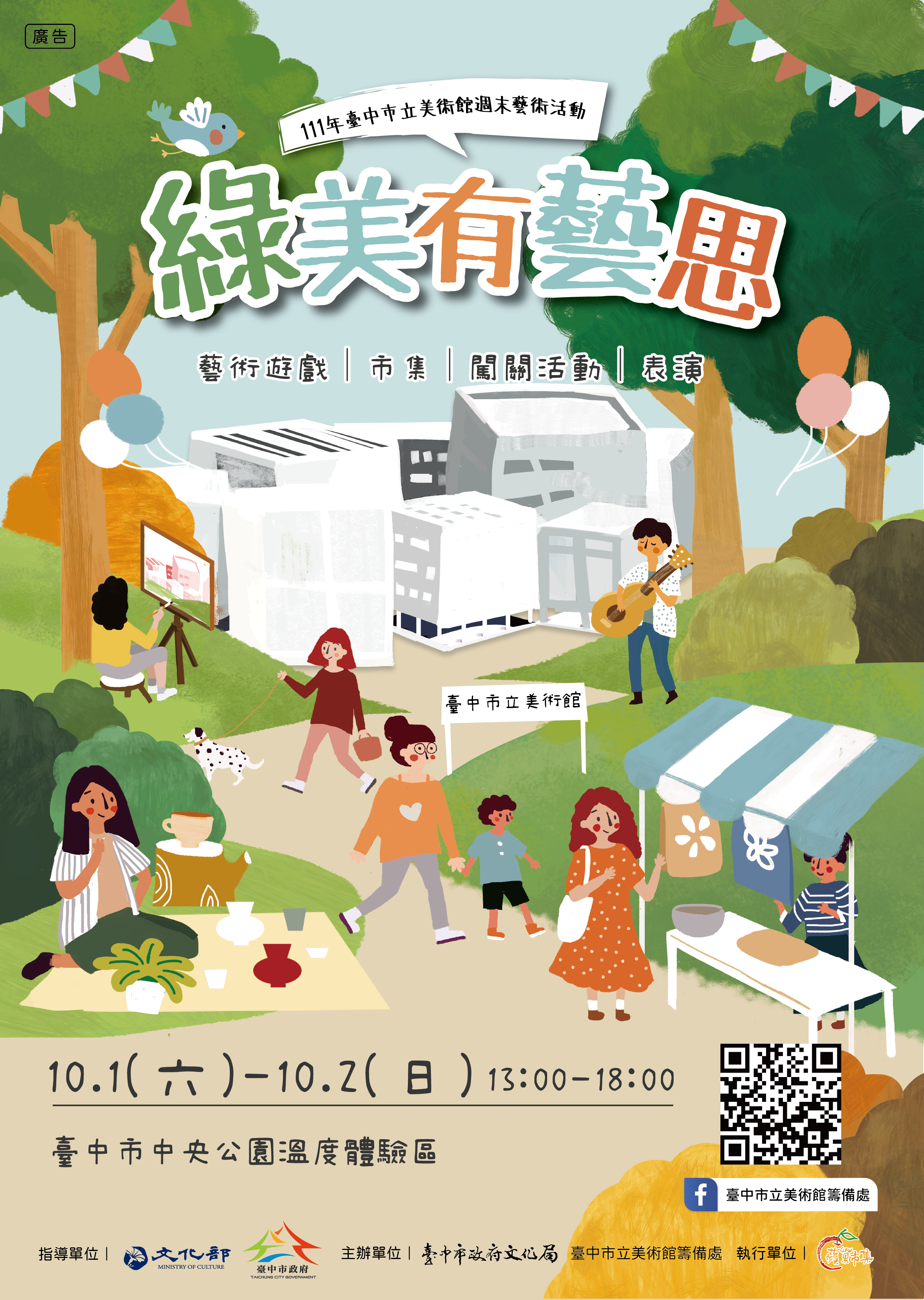 坐落於水湳經貿園區將於114年開館營運的台中「綠美圖」,今年特別由台中市立美術館籌備處規劃「綠美有藝思-111年台中市立美術館週末藝術活動」, 10月1、2日下午1時將在中央公園溫度體驗區登場,內容結合藝術遊戲、闖關、市集、表演等,其中最熱門的「綠手指創作藝術遊戲」9月12日將開放線上報名,歡迎家長把握機會和孩子一起共度好藝術、好好玩的週末時光。