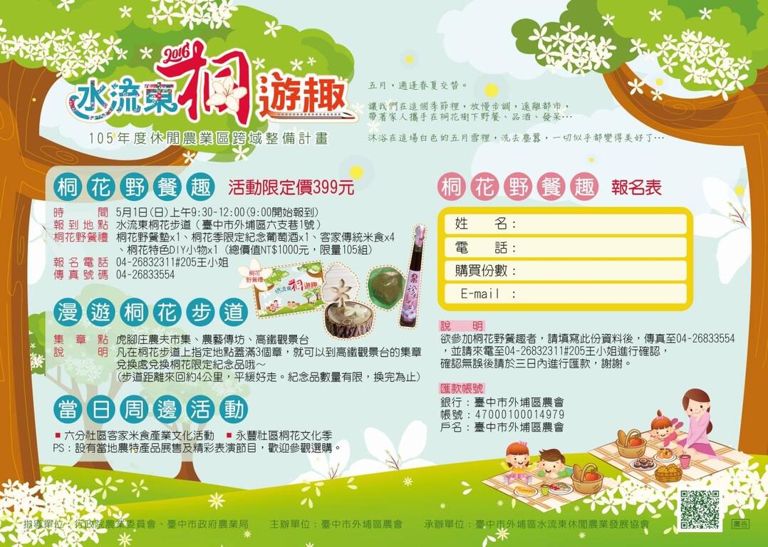 五月是桐花盛開的季節,市府農業局輔導外埔區農會於週日(5/1)在外埔水流東桐花步道舉辦「2016水流東桐遊趣」活動,邀請民眾在桐花樹下野餐(需事先報名,已額滿),也能漫遊桐花步道(毋須報名,自由參加)欣賞美麗「五月雪」,在指定地點集滿3個印章還可兌換桐花限定紀念品!