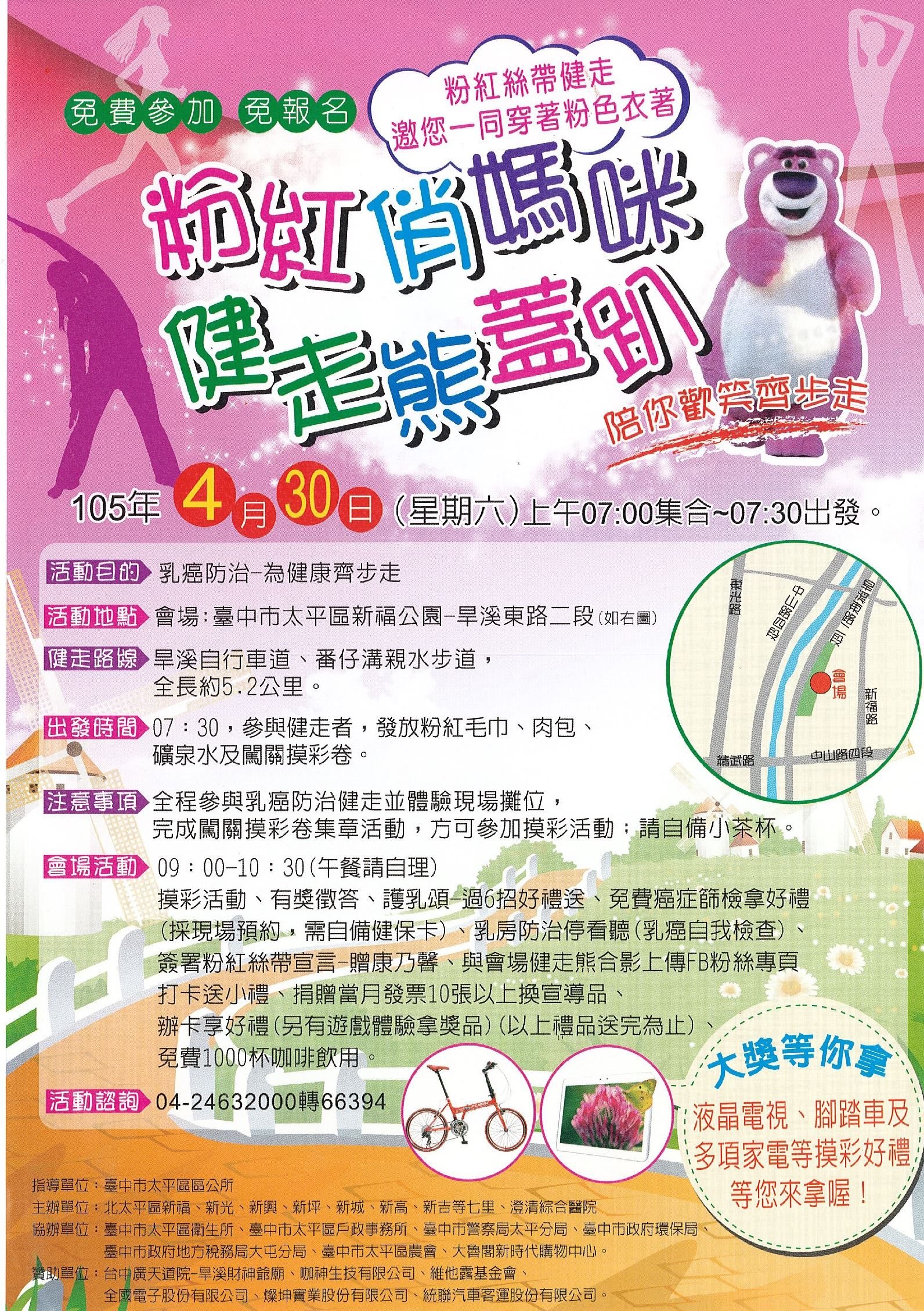 週六上午7時在太平區新福公園有「粉紅俏媽咪健走熊蓋趴」健走活動,歡迎民眾穿著粉紅色衣服一同來健走,活動免費參加,還可獲得粉紅涼毛巾、肉包、礦泉水及闖關摸彩券哦!週末還有不少表演、展覽等活動,更多週末活動訊息,請見附件「中市週末活動看板表格0430_0501」。