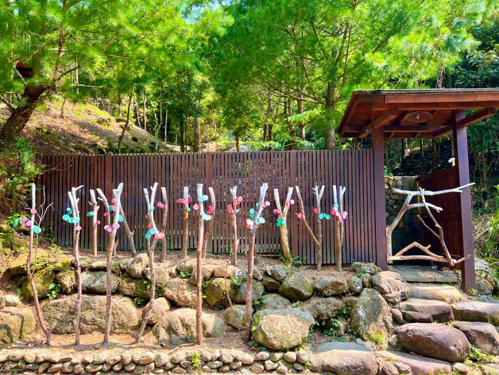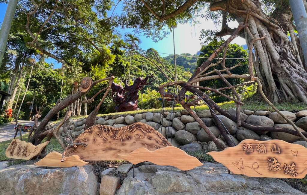 此外,在藝術村園區步道入口處的作品〈落英繽紛〉,由藝術家溫岳彬運用廢材樹枝及木料切片,組合出酒桶山的象徵圖騰,充滿變化層次的木材紋理,寓意著酒桶山繁茂的森林生態,溫岳彬期待民眾在作品中,感受藝術融入並呼應環境的魅力;藝術家王昱奇認為,公共藝術需要民眾的參與及融入環境,因此以石頭、木材打造出大冠鳩的羽翅〈護〉,以藝術手法回應環境與呈現酒桶山的在地生態。