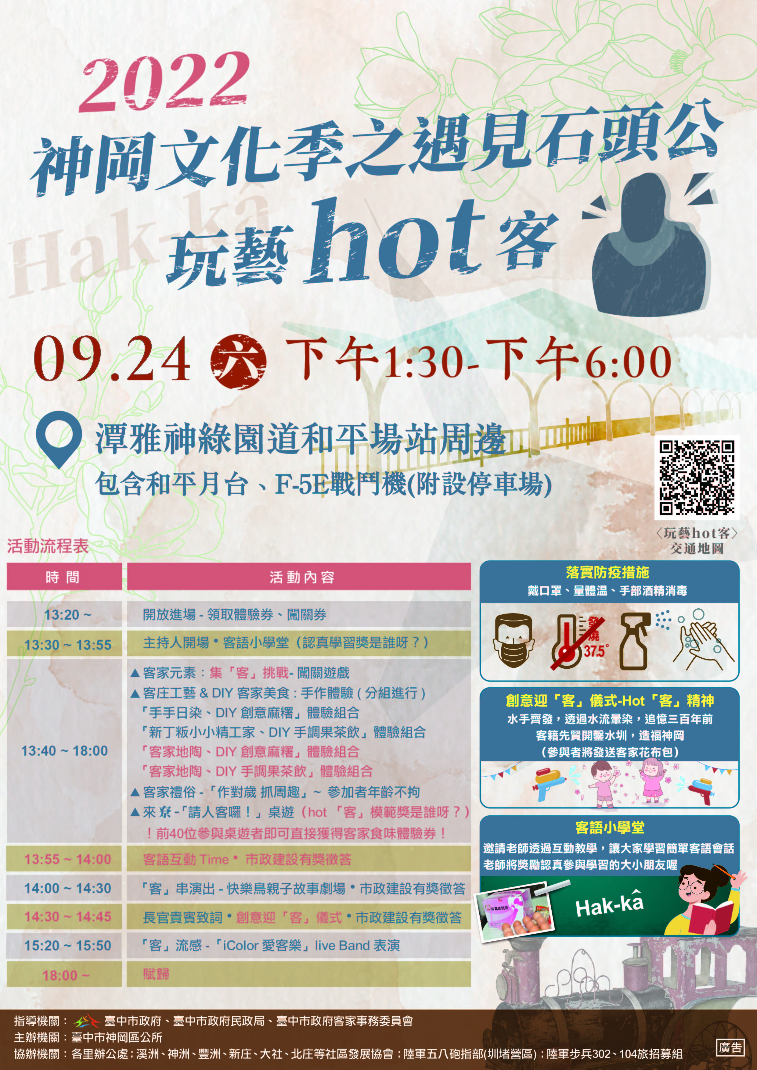 (2)「客」串演出:邀請「快樂鳥親子故事劇團」量身打造劇本,由客籍先賢張達京開鑿水圳灌溉北台中平原起,迎媽祖建萬興宮、及三百年來的石神與誼子故事傳說,延伸至現今臺中市政府育兒政策。看話劇,搶答問題,可獲神粉好禮。 - 創意迎「客」儀式:什麼儀式呢?水手齊發,透過水流暈染,追憶三百年前客籍先賢,Hot「客」精神開鑿水圳,造福神岡。