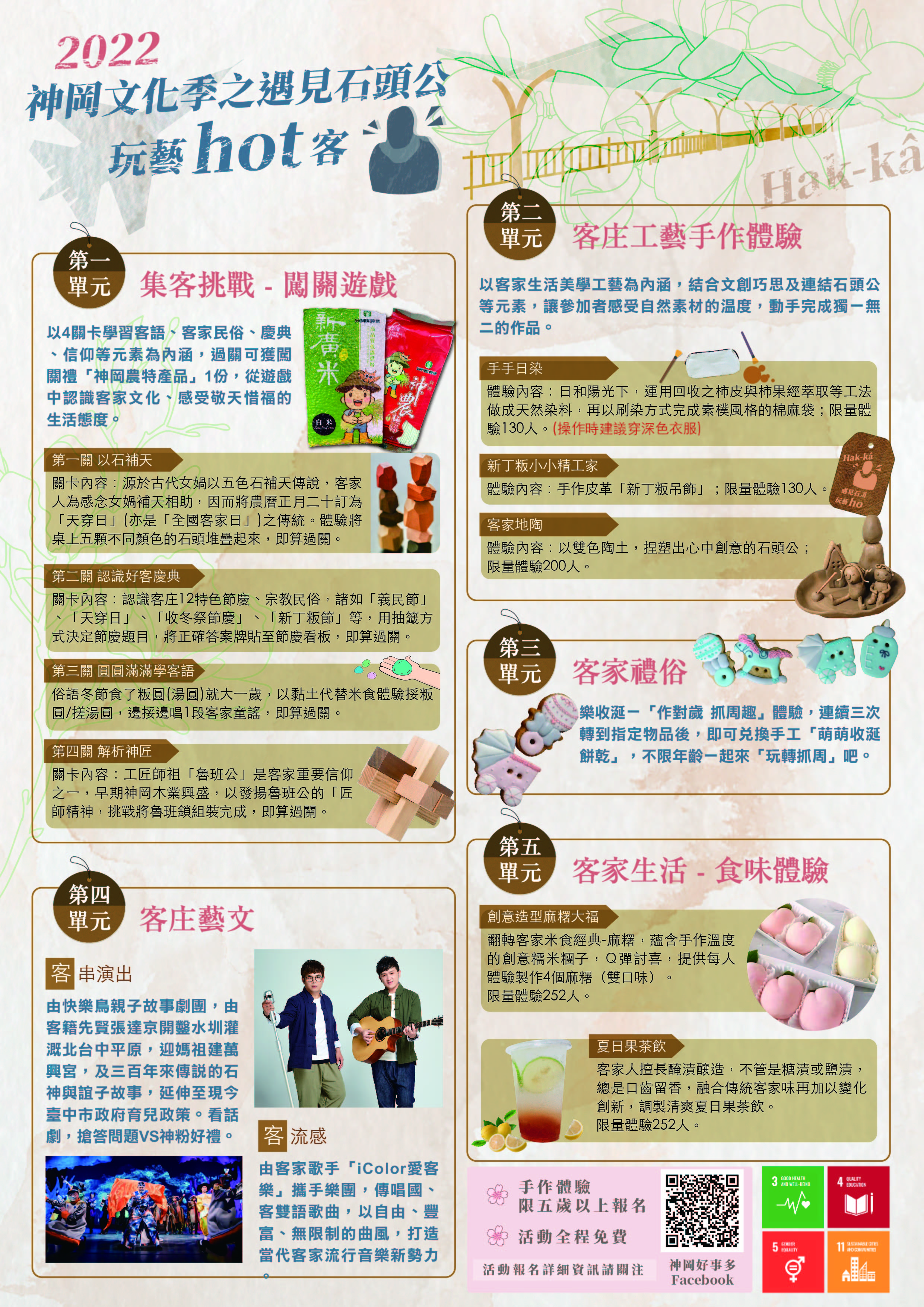 (三)活動內容:共分成五大單元、1項儀式及客語小學堂-簡單會話教學,活動全程免費,內容豐富、多元、富創意,絕不容錯過。