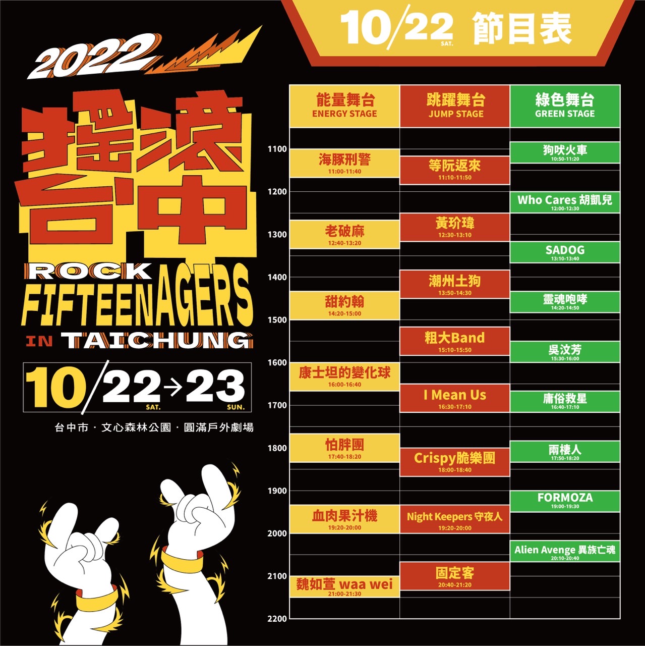 新聞局補充,「2022搖滾台中」演出陣容包括魏如萱 waa wei.麋先生.血肉果汁機.美秀集團.持修.怕胖團.康士坦的變化球.甜約翰.南西肯恩.荷爾蒙少年.P!SCO.海豚刑警.I Mean Us.icyball冰球樂團.Crispy脆樂團.溫蒂漫步.OBSESS.吳汶芳.淺堤.守夜人.老破麻.溫室雜草.Multiverse.潮州土狗.芒果醬.王彙筑.黃玠瑋.固定客.震樂堂.琳誼Ring.BIKE機踏車樂團.溫妮 WINNI.FORMOZA.Alien Avenge 異族亡魂.粗大Band.SADOG.步行者.妮可醬.庸俗救星.遊樂 ULove.暴君.鐵擊.兩棲人.等阮返來.Who Cares 胡凱兒.靈魂咆哮.狗吠火車.21世紀無聊男子等。更多「2022搖滾台中」相關資訊可上搖滾台中官方FB粉絲專頁( https://www.facebook.com/RockInTaichungMusicFestival/ )查詢。