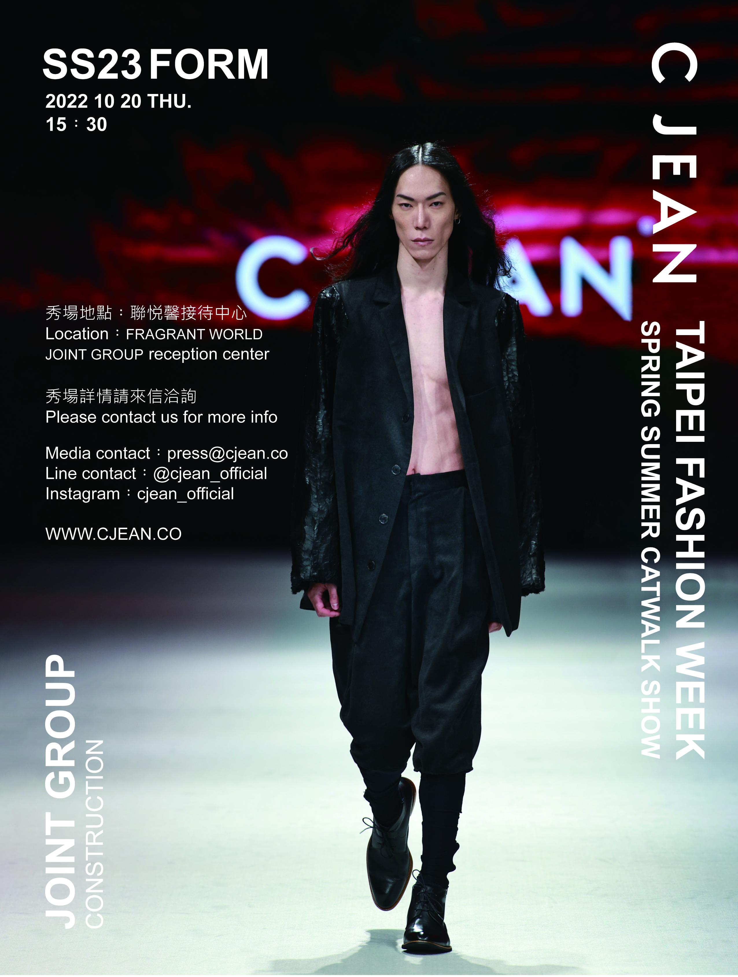 本次除了發表新作外,更邀請了聞名國際的日本知名音樂.舞蹈團體「世界的秩序 WORLD ORDER」成員來台與模特兒一同擔綱演藝C JEAN SS23時裝大秀,以與「聯悦馨」聯名的「TSUTAYA BOOKSTORE」國際級書店品牌做為開端
