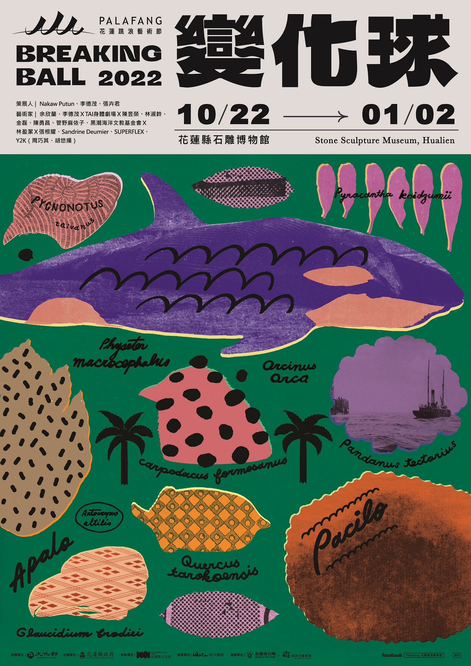 二、本活動以「花蓮當代藝術」為展示基調,並以「地方學」為策展核心概念,每一屆持續以視覺藝術展演形式建構花蓮當代藝術史之紋理脈絡。今年辦理第二屆主題定為「變化球」,由三位策展人Nakaw Putun、李德茂、張卉君領軍,邀請余欣蘭、林淑鈴、金磊、陳勇昌、菅野麻依子、黑潮海洋文教基金會X林盈潔X張根耀、SandrineDeumier、SUPERFLEX、李德茂X TAI身體劇場X陳昱榮、Y2K(周巧其、胡悠揚)等10組藝術家共同展出。