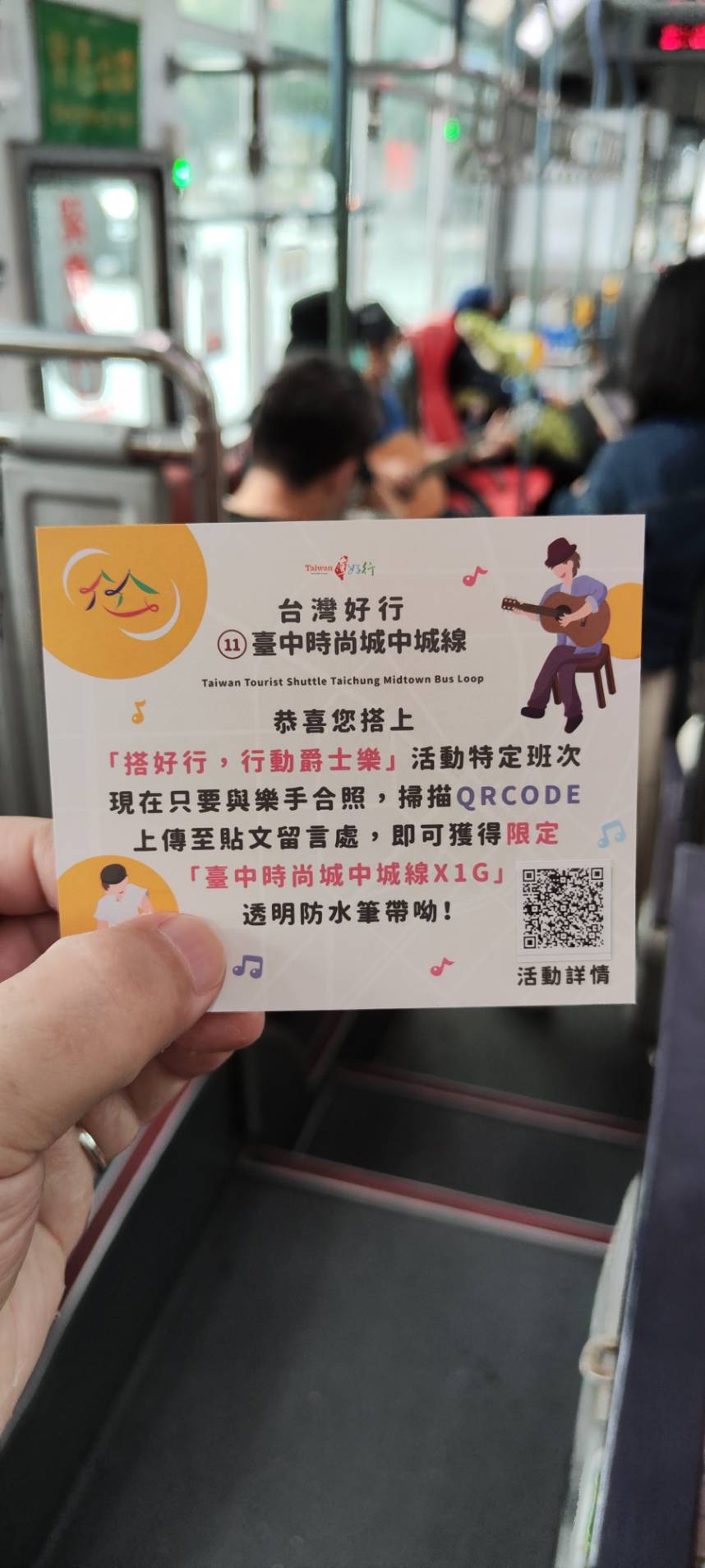 韓局長也提到,15日沒有參加到「搭好行 行動爵士樂」的旅客也不要失望,下周六10月22日還會舉辦2場次的車內行動音樂會,只要於台中火車站D月台搭乘16時11分或17時41分台灣好行-台中時尚城中城右環線班次,在前往草悟道市民廣場的車程中,就可以一同優先體驗不插電的行動爵士音樂會。此外,當天只要到PARK2草悟廣場1樓電梯旁與1G聯名的台中時尚城中城線打卡區拍照打卡,即可至旁邊服務台兌換1G聯名推廣品,數量有限,送完為止,歡迎旅客帶著全家大小,一同來搭乘台中時尚城中城線參加爵士音樂節,感受台中草悟道獨有的音樂及悠閒生活風格。
