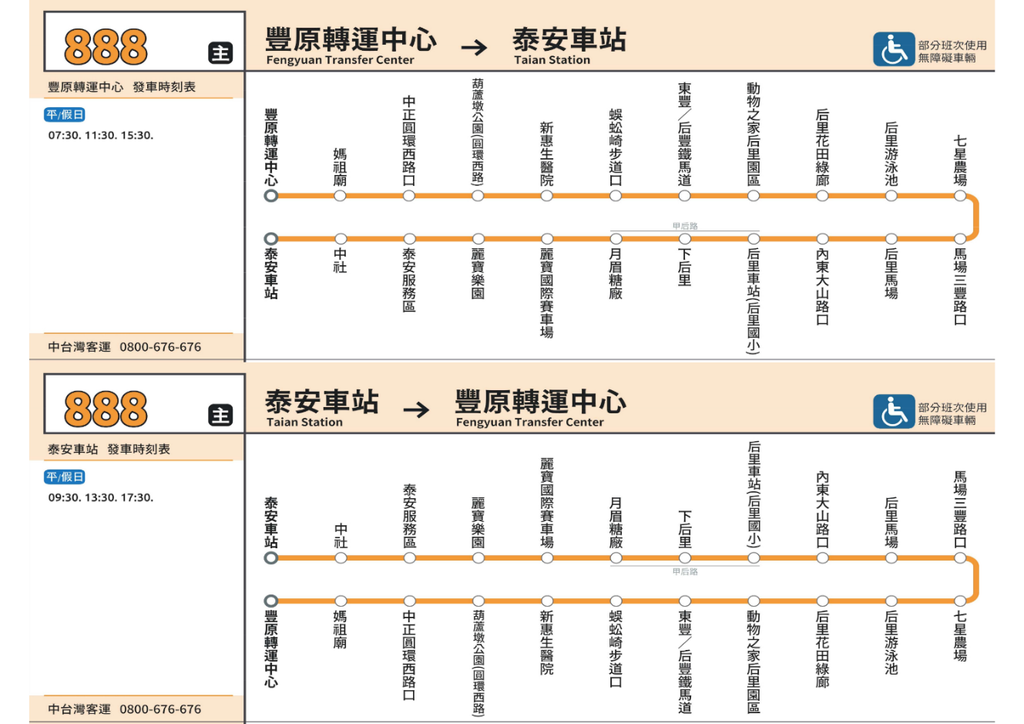 交通局說明,888路公車由中台灣客運營運,採固定時刻發車,營運服務時間豐原轉運中心端7時30分至15時30分,泰安車站端9時30分至17時30分,該路線10月23日起將上路,相關乘車資訊可到「台中市政府交通局」官網( http://www.traffic.taichung.gov.tw )、「台中市即時公車動態資訊」網站( http://citybus.taichung.gov.tw/ebus )查詢,或到交通局官網( https://is.gd/MTPvdg )下載台中公車APP,如有問題可撥免費專線「1999」,歡迎民眾多加利用。