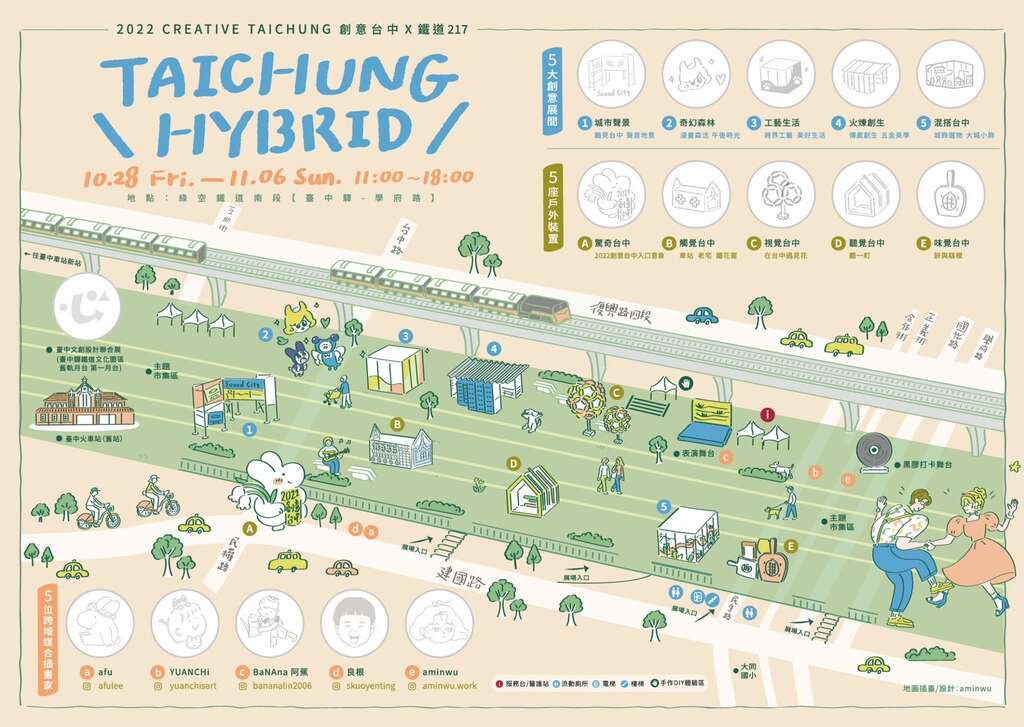 文化局指出,為導引民眾按圖索驥,逐一造訪精彩豐富的展覽作品,特邀插畫家aminwu繪製活動摺頁集章地圖,以台中「舊城區的摩登時代」為主題,將復古舞蹈元素融入各行業人物中,如購物女子、黑手大哥、旅人、工藝家、舞者等,展現歡樂節慶氛圍;活動期間民眾可於服務台索取摺頁,至各集章點蓋滿至少10個章後,填寫活動問卷,即可至服務台兌換主視覺口罩等小禮。