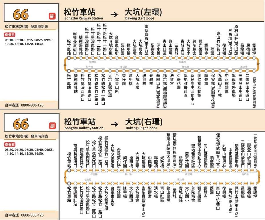 交通局長葉昭甫表示,戶外休閒風氣盛行,為便利民眾到大坑運動、旅遊,交通局推動登山公車路線即將上路,調整66路假日18個班次為「66副」,路線營運時間為5時10分至16時50分,自捷運與台鐵松竹站東側的軍福十九路發車,經捷運舊社站後直行松竹路前往大坑1、2、3、9、10號等登山步道。